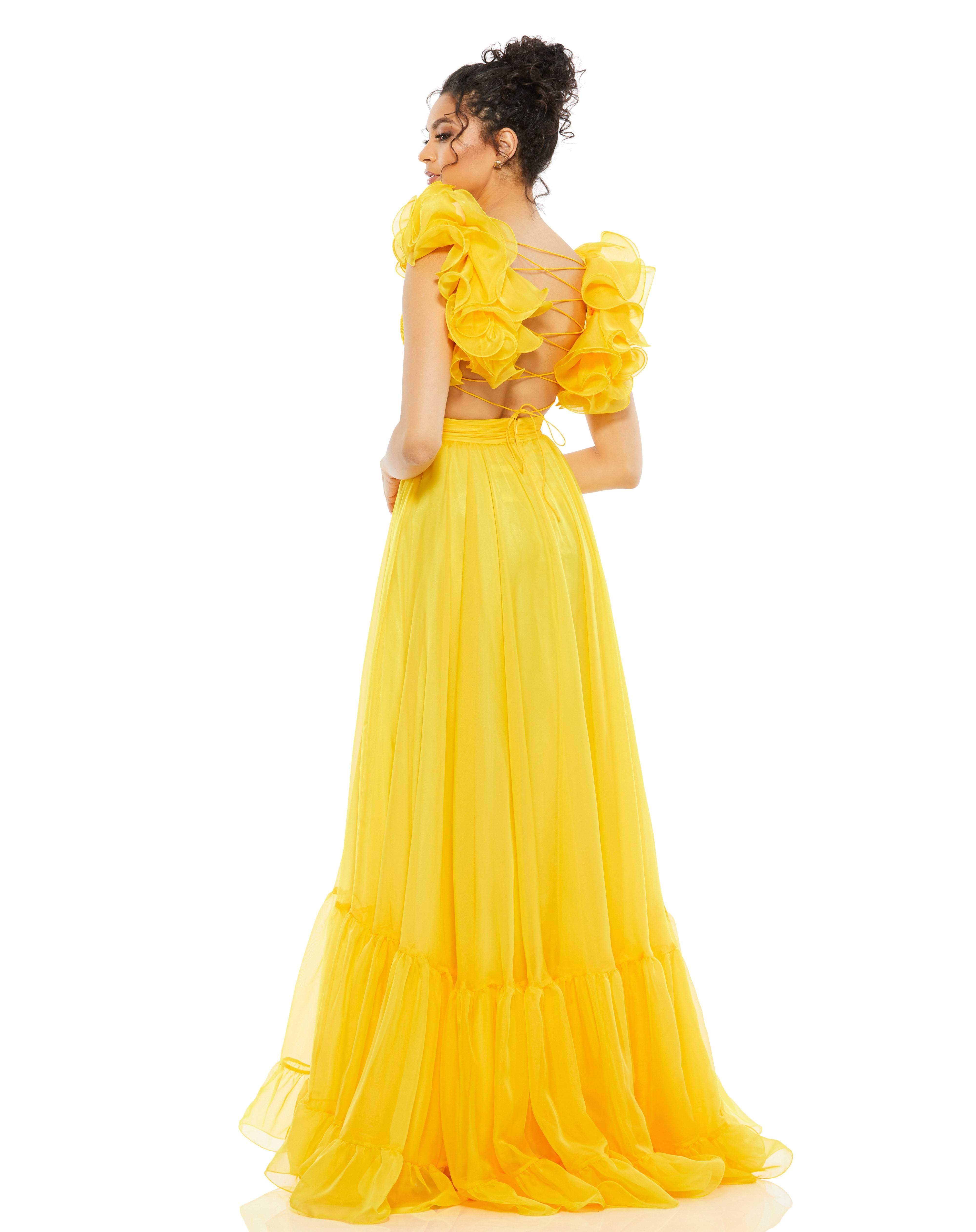 Details: Ruffled Accents, Side Cutouts, Lace Up Back, Tiered Skirt, Sweep Train