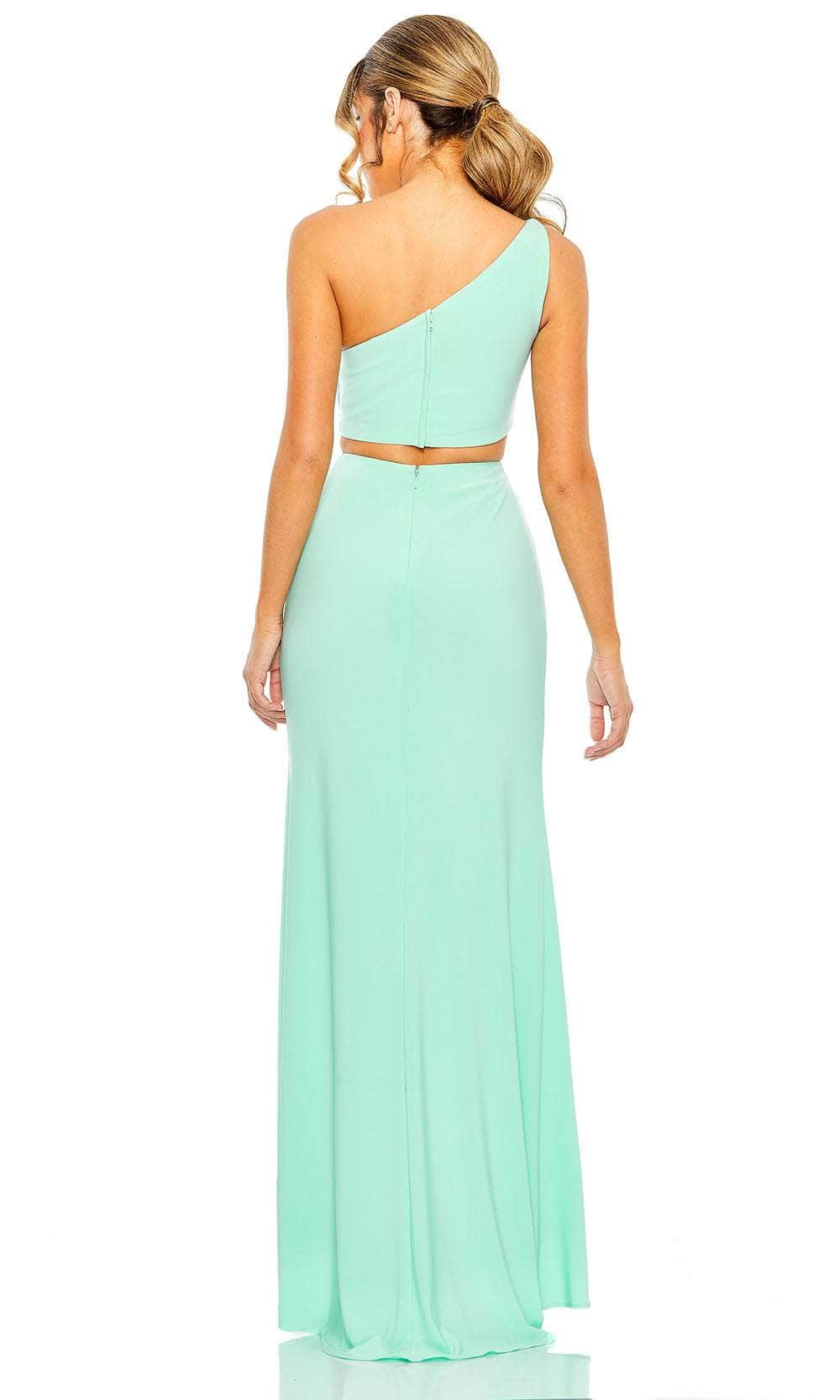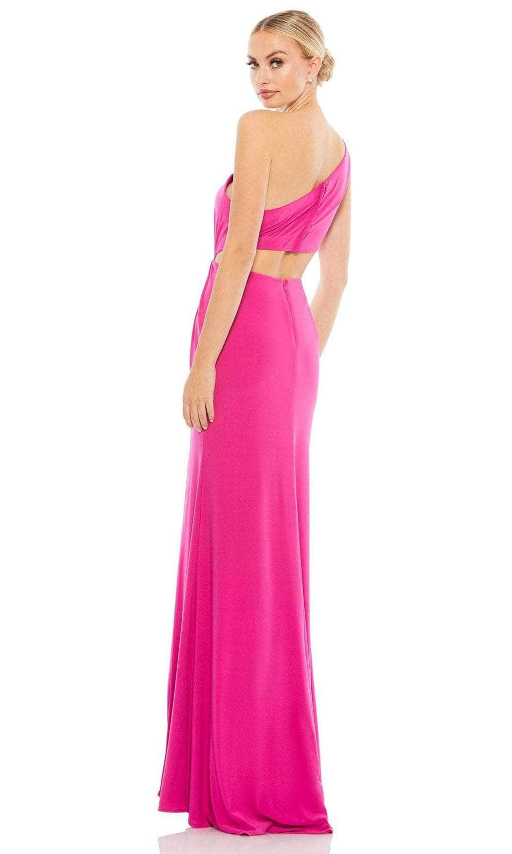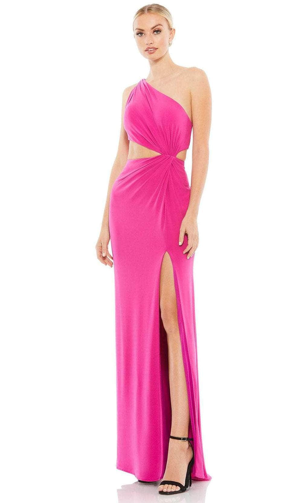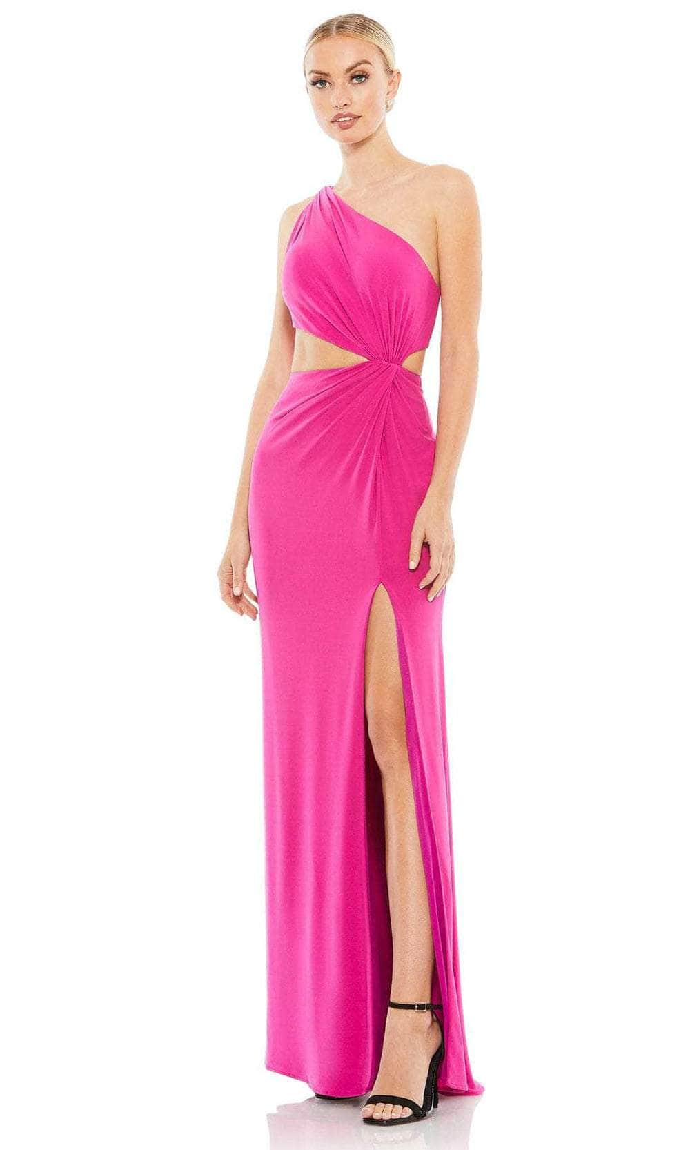 Elegance meets boldness in Mac Duggal 67937, crafted from luxurious Jersey Knit. The one-sleeve design features intricate ruched detailing on the fitted bodice, creating a sophisticated look. The asymmetrical neckline, side, and back cutouts add a touch of allure and modern flair. Secured with a central zipper at the back, both on the bodice and the skirt, this floor-length dress boasts a sheath silhouette, perfectly accented by a slit, making it a captivating choice for a statement-making entrance at any formal occasion. Get ready for everyone to stop and stare with this Mac Duggal 67937. Models are wearing Magenta and Mint colors.