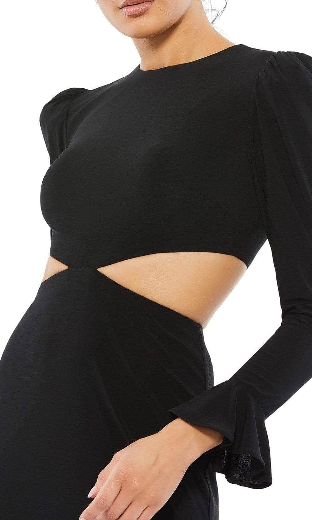 Envision the ideal evening in this elegant Ieena Duggal 67944 dress. This full length dress fashions a jewel neckline supported by long sleeves in a fitted bodice with midriff cutouts. Revealing a sheath silhouette, this also shows a full back with back zipper closure. Enhance your visual appeal in this simple yet classy Ieena Duggal creation. Model is wearing Black color.