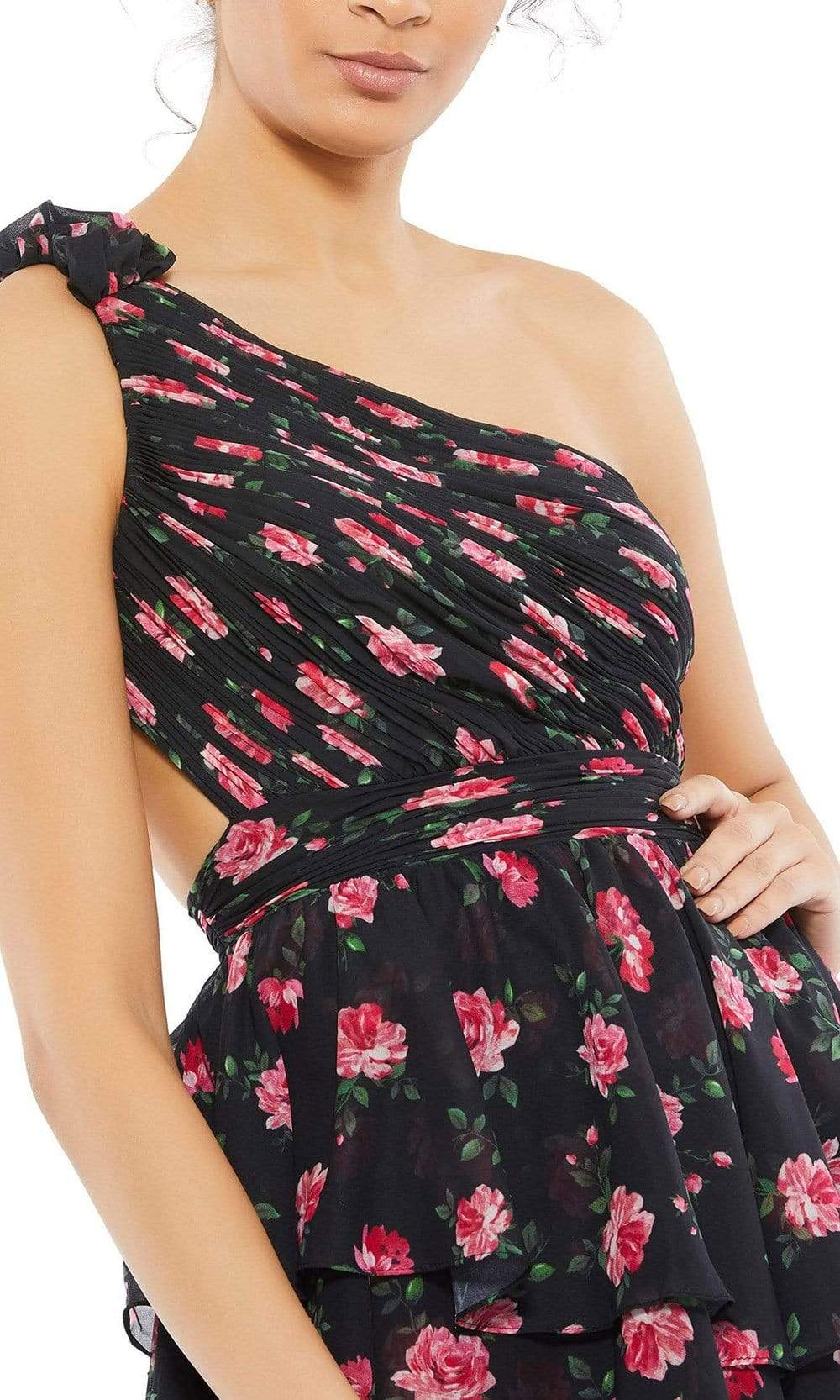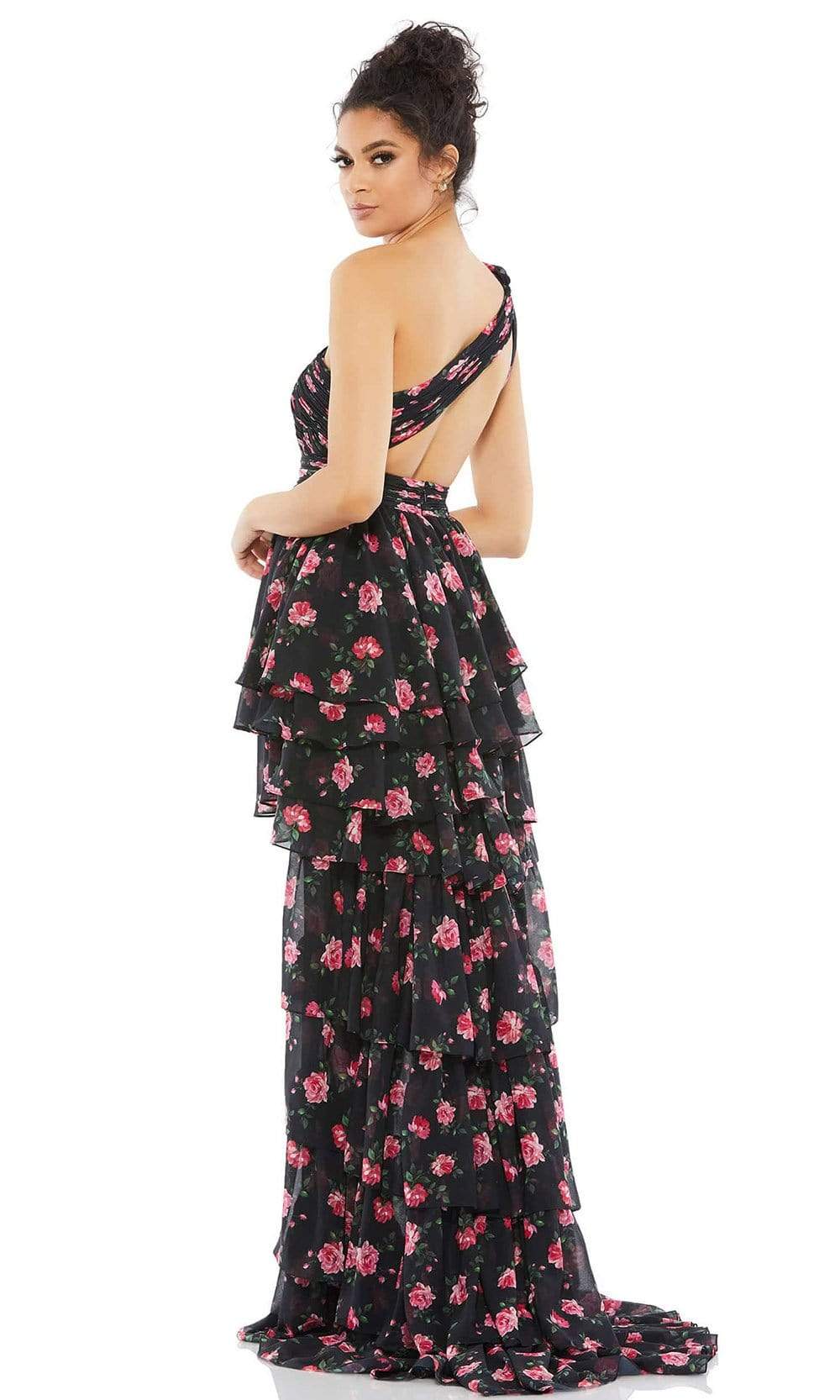 Get the party started in this spectacular dress from Mac Duggal 70246. Bloom and blossom in this floral printed high low dress. It has a ruched bodice and a cut out open back. Neckline is asymmetric and has one shoulder strap. Skirt is a tiered A-line with a short front and a long back with a sweep train. You are sure to turn heads in this Mac Duggal dress.