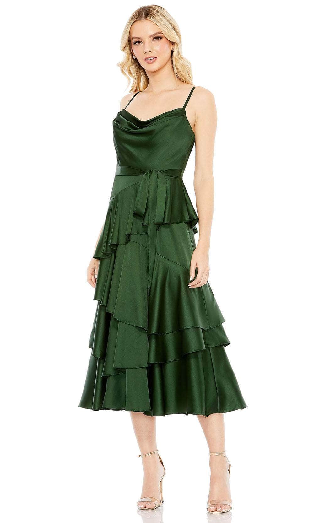 Stand out as the star of the night by wearing the Ieena Duggal 68300 creation. This sleeveless dress is fashioned from charmeuse fabric and exhibits a cowl neckline with spaghetti straps for support. The self-tie belt cinches in your waist for a feminine look. The open cut in the back adds allure and reveals a glimpse of your skin. Heightens with an asymmetrical ruffle-tiered detailing, the skirt attractively shapes an A-line silhouette that streams to the tea-length hemline. This Ieena Duggal 68300 dress is a striking addition to any special occasion. Models are wearing Forest Green, and Nude colors.