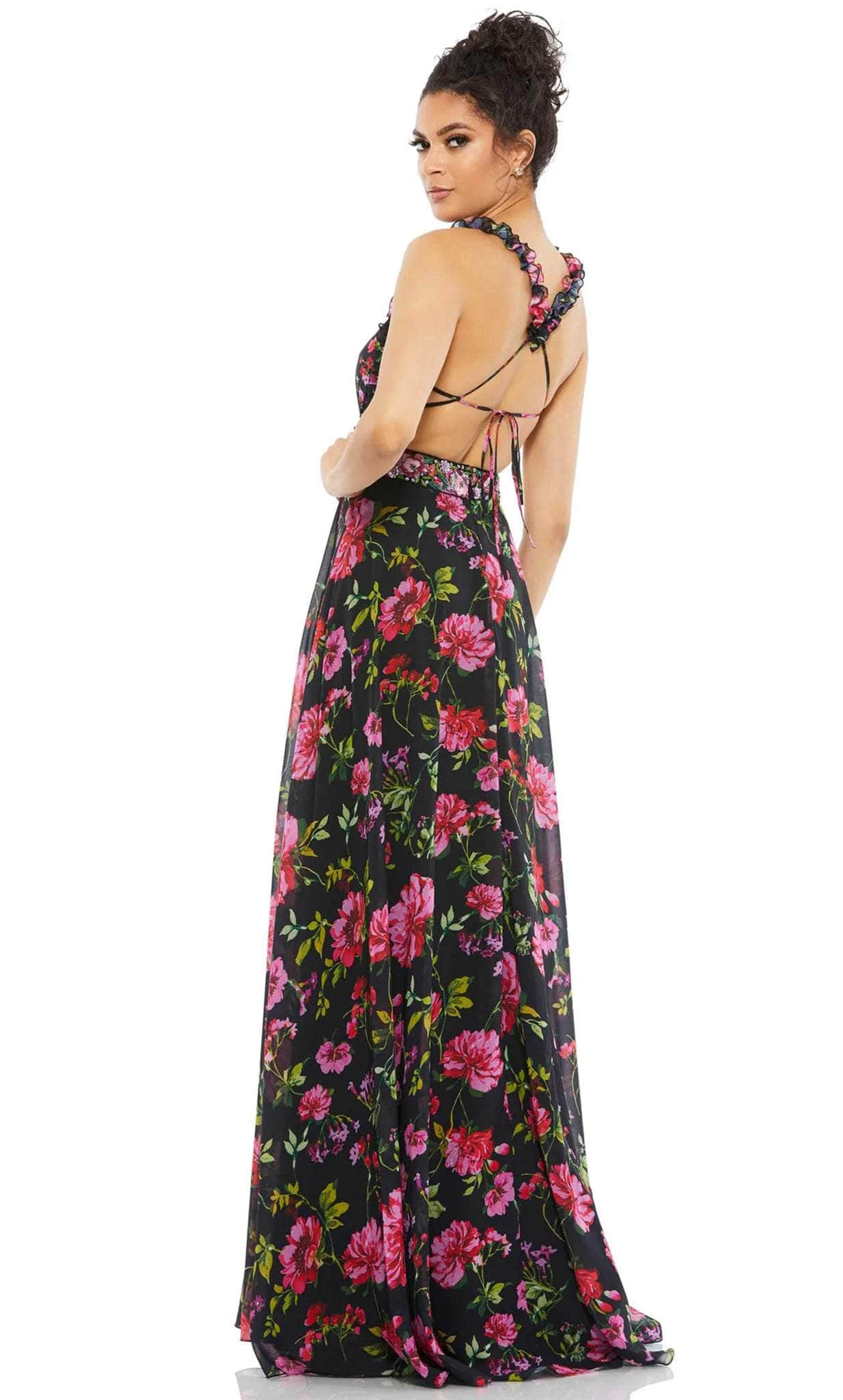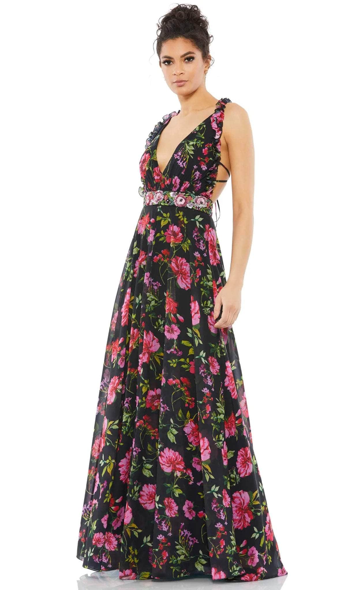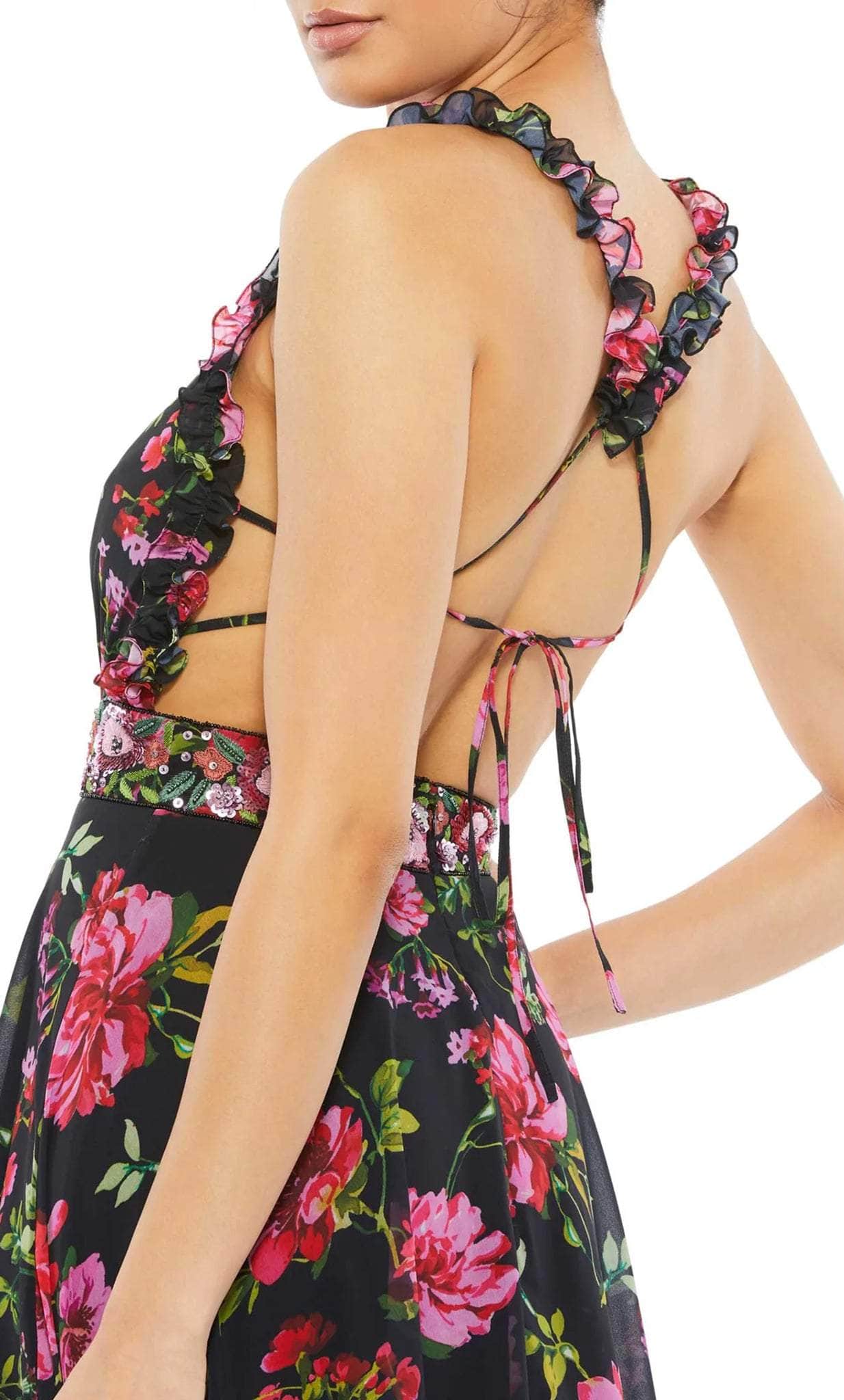 Turn yourself into a head-turning beauty by slipping into this absolutely eye-catching dress by Mac Duggal 9156. Fresh and feminine, this floor length gown is adorned with bold floral prints all throughout. The wide halter V neck straps are accented with fabulous ruffles, while the plunging V neckline adds a daring touch. The open back is complemented by strappy detail and a floral applique waistband. Dance the night away with this A-line masterpiece by Mac Duggal 9156 Model is wearing Black Multi color.