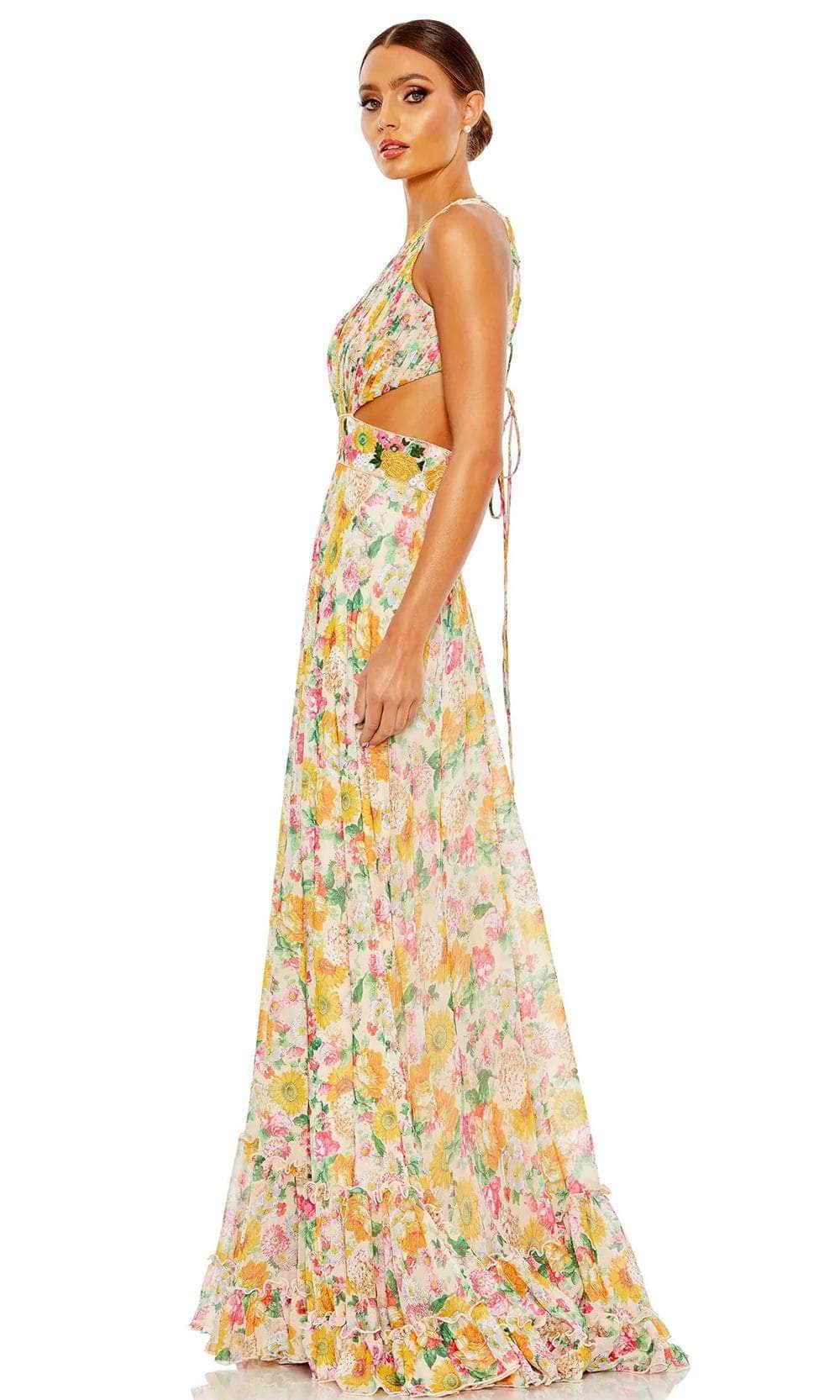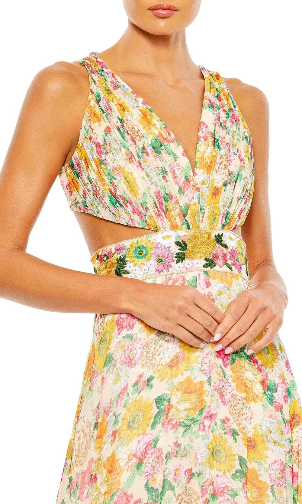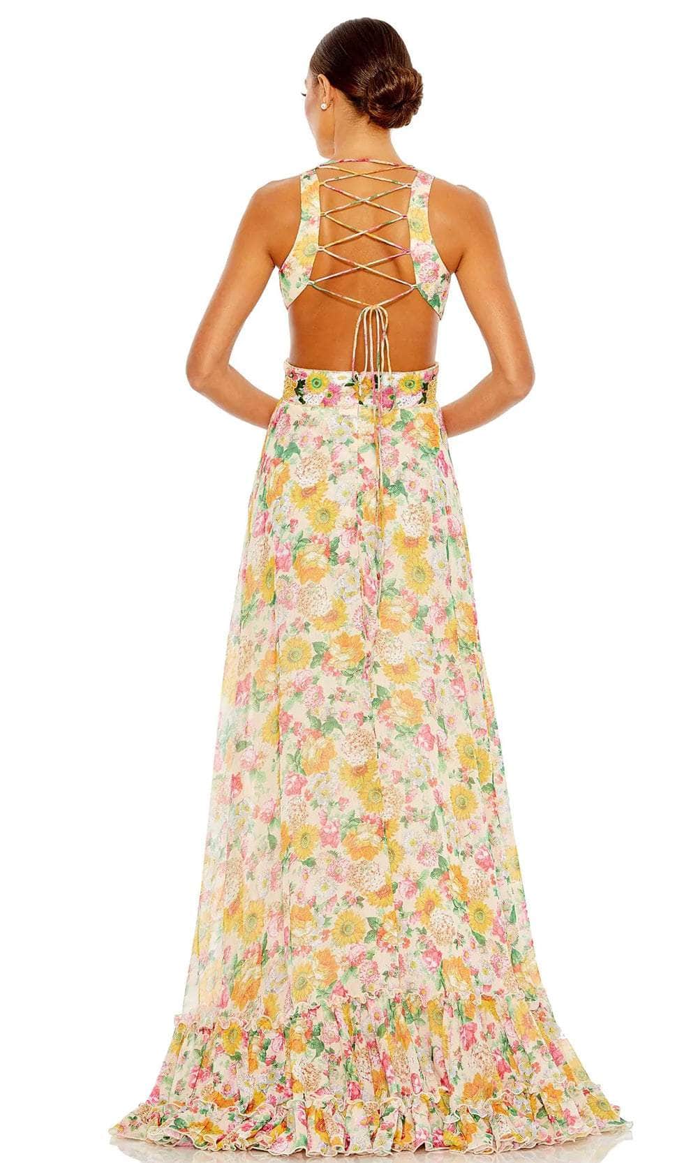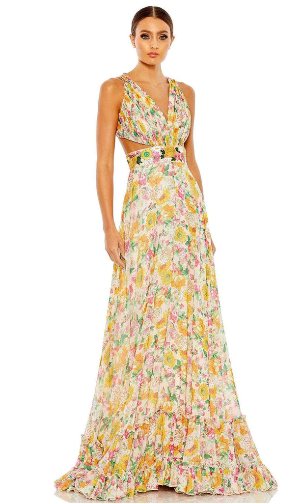 Look amazing for the party in this Mac Duggal 9174 creation. This gorgeous piece features a sleeveless V-neckline, side cutouts, and a floral embroidered waistband in a pleated bodice. The open back features a lace-up design to help fasten the garment, while the A-line skirt cascades down and ends with a gorgeous ruffled hemline. Brave the evening with temptress beauty and grace wearing this Mac Duggal 9174 creation. Model is wearing a Nude Multi color.