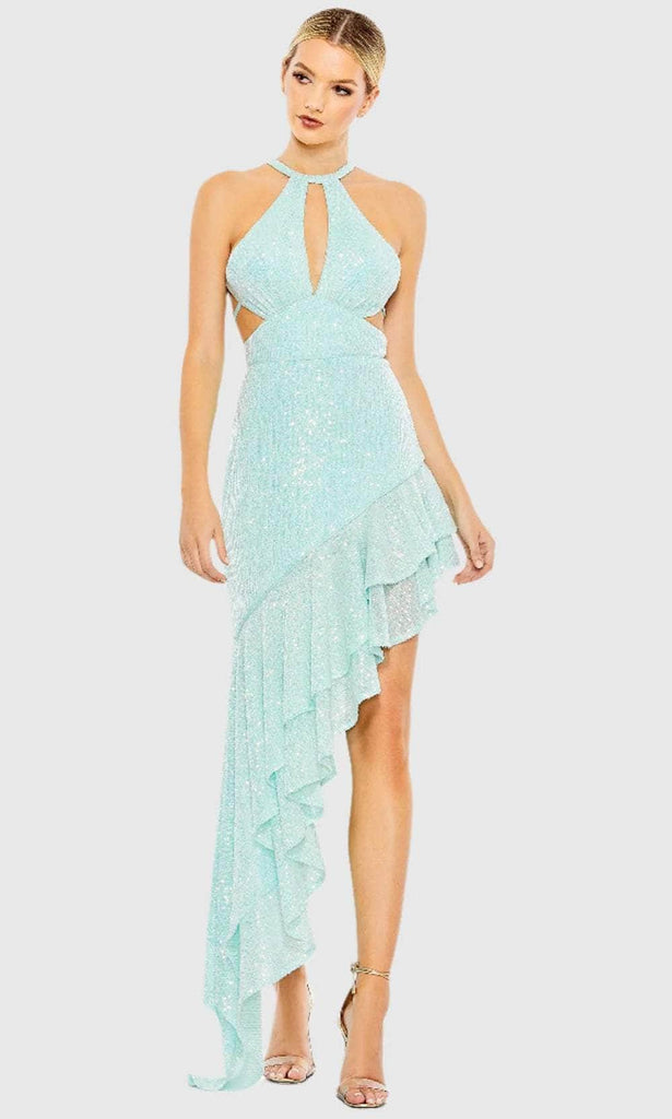 Shine brightly in this enchanting dress from Ieena Duggal A11274. Capture attention in this sleeveless dress entirely adorned with shimmering sequins. It boasts cutout details in the bust and side waist for added enticing allure. Features include the halter neckline, wide waistband, and an open back with a tie strap. With its asymmetrical high-low hemline, the sheath skirt beautifully exposes your legs. The tiered ruffle design adds a playful finish. Embrace your sexy side and dance confidently in this Ieena Duggal A11274 masterpiece. Models are wearing Aqua, and Nude colors.