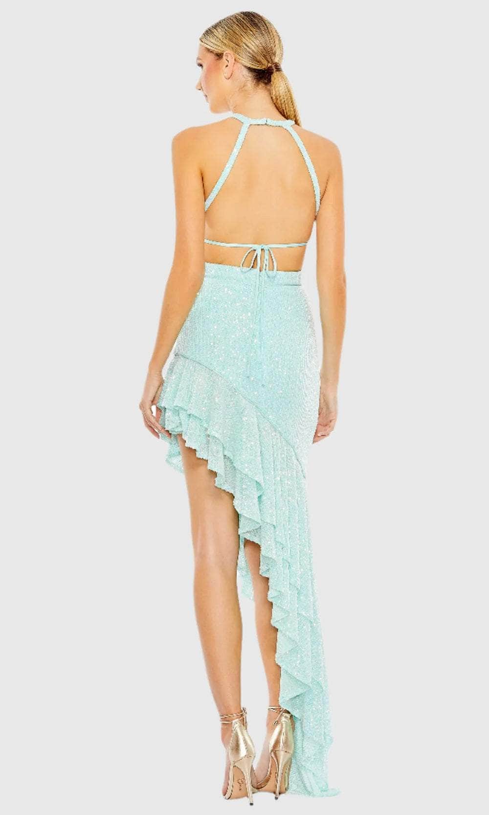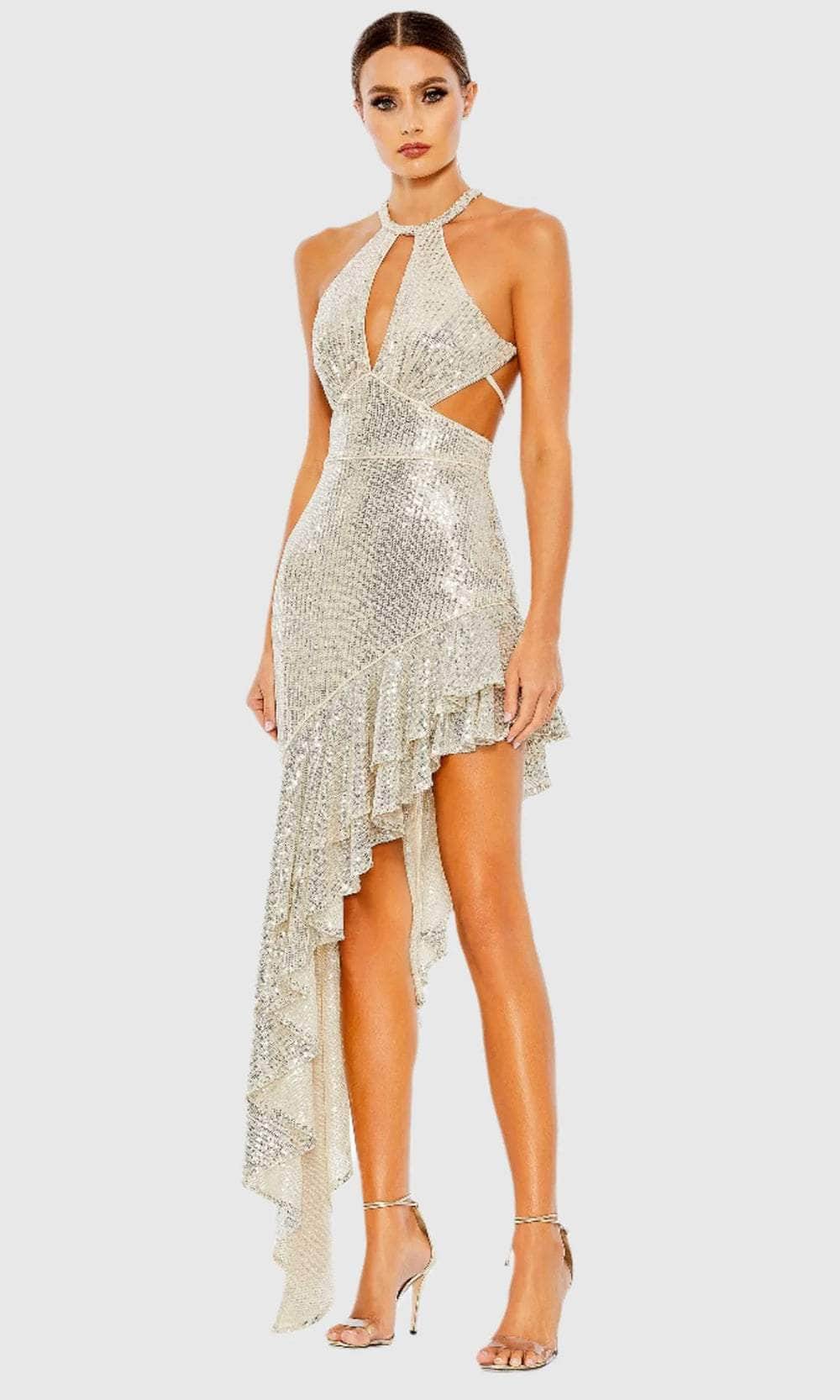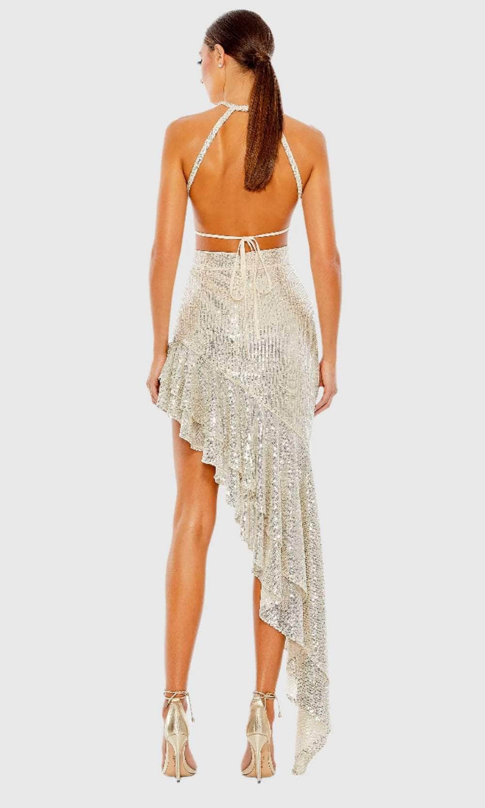 | Details: | Sleeveless, Cutout Bodice, Sequins, Asymmetrical Ruffle Hem, Strappy Open Back, Fitted |