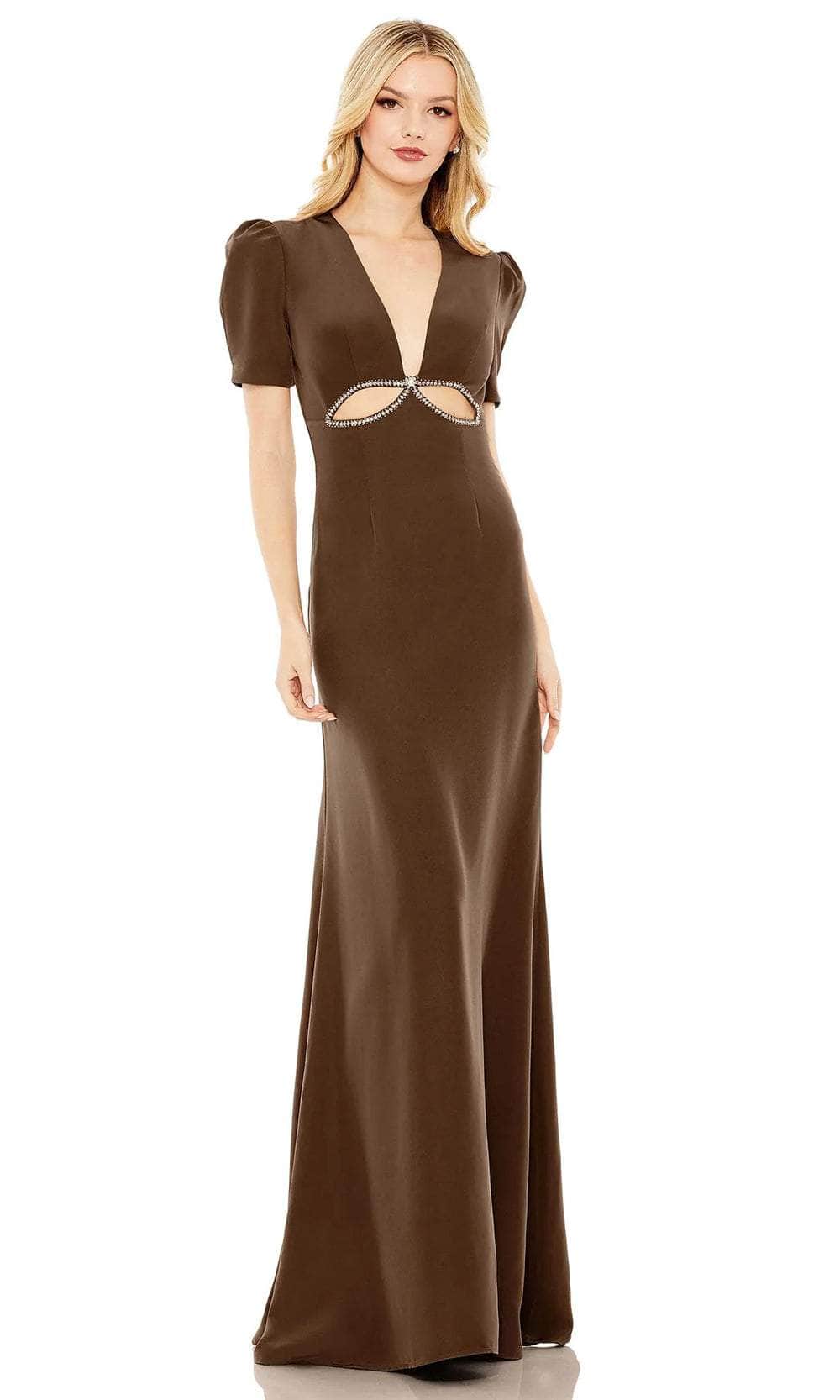 Captivate with a touch of modern allure in the Ieena Duggal A2630 masterpiece. This jersey evening dress sculpts your form with a tailored lining, ensuring a flawless drape that flatters your every curve. The luxurious jersey fabric offers a touch of contemporary sophistication, while the subtle puff shoulders and short sleeves add a hint of understated elegance. The plunging V-neckline creates a silhouette accentuated by captivating beaded front cutouts that shimmer with a touch of glamorous detail. The slender sheath skirt cascades into a graceful sweep train. Captivate the room with your sophisticated allure in this Ieena Duggal A2630 creation. Models are wearing the Espresso and Red colors.