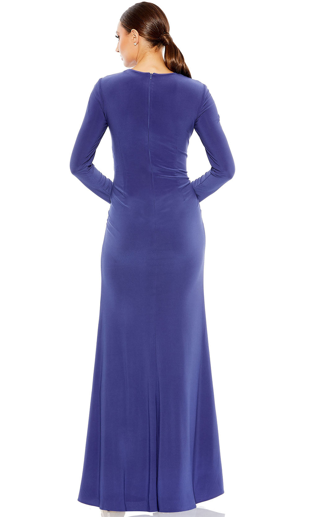 Understated drama takes the spotlight in this sleek silhouette from Ieena Duggal A55708 style. Featuring a jewel neckline with a keyhole opening and long fitted sleeves, the gown blends coverage with allure. Strategic knotted detail and ruching across the waist flatters the midsection, while the thigh-high slit adds bold sophistication. Crafted in jersey for a smooth and contoured drape, this sheath gown moves effortlessly with the body. Modern and confident, the Ieena Duggal A55708 is an elevated look for evening occasions that favor structure and simplicity. Models are wearing Brick Red, and Indigo colors.