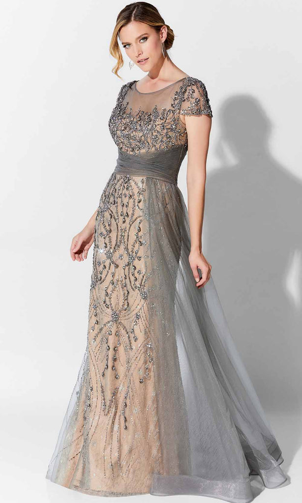 Show off your fabulous curves in this alluring evening gown by Ivonne D 122D62. With a sheer bateau neckline and cap sleeves, this dress is styled in beaded tulle over lace. This slim-flare mother of the bride gown features a ruched crisscross waistband with side streamer and horsehair hem, as well as a keyhole back and sweep train. Feel gorgeous when you walk into the party wearing this Ivonne D evening gown. Whether your style is modern trendy or timeless classic, Mon Cheri will clothe with poise, elegance and grace for your momentous occasion. Model represents the dress in Charcoal/Nude color. Find more mother of the bride dresses.