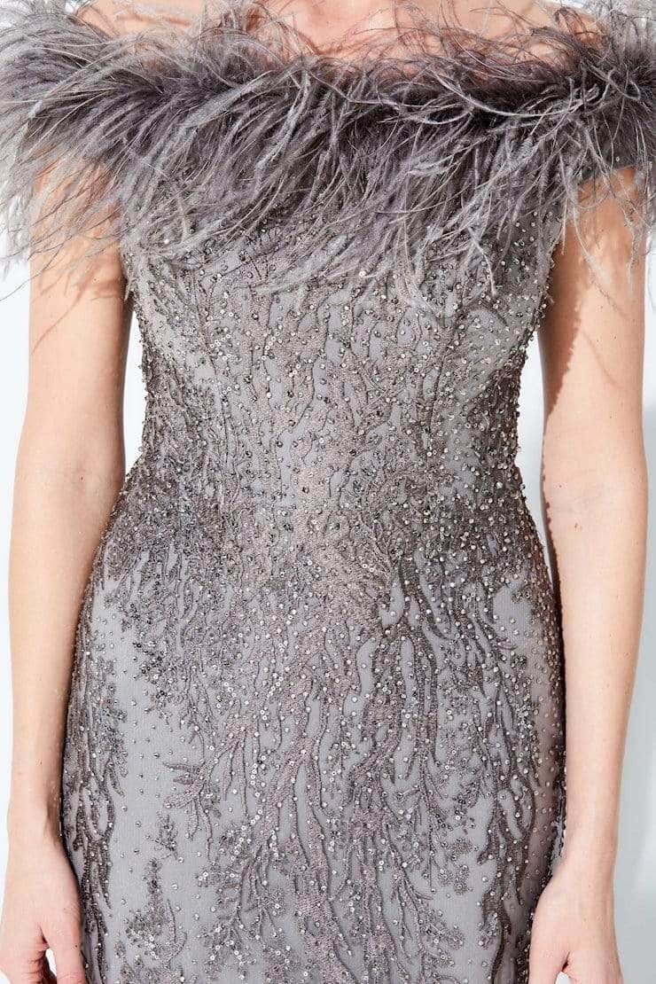 This novelty embroidered gown features an off-shoulder fit with a straight neckline and a fit and flare skirt. Stone accents are all over the dress with a sweep train. Feather boa is included in the set. Models are wearing the Gray, Navy Blue and Wine colors.