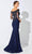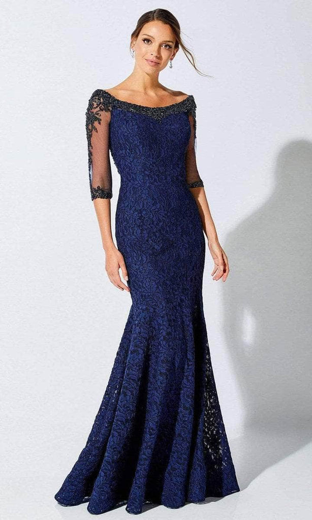 This dress highlights a bateau neckline supported by half sleeves in a fitted, beaded and lace bodice. The skirt reveals a trumpet silhouette while the back shows a mid-open back with back zipper closure to complete the look. Model is wearing Navy Blue color.