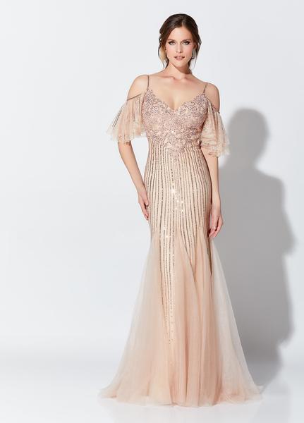 | Details: | Beaded Bodice, Fitted, Sleeveless, Cold Shoulder Cutout, Spaghetti Straps, Flutter Sleeves, Floor Length, Godet Skirt, V Back, Back Zipper Closure, Sweep Train |