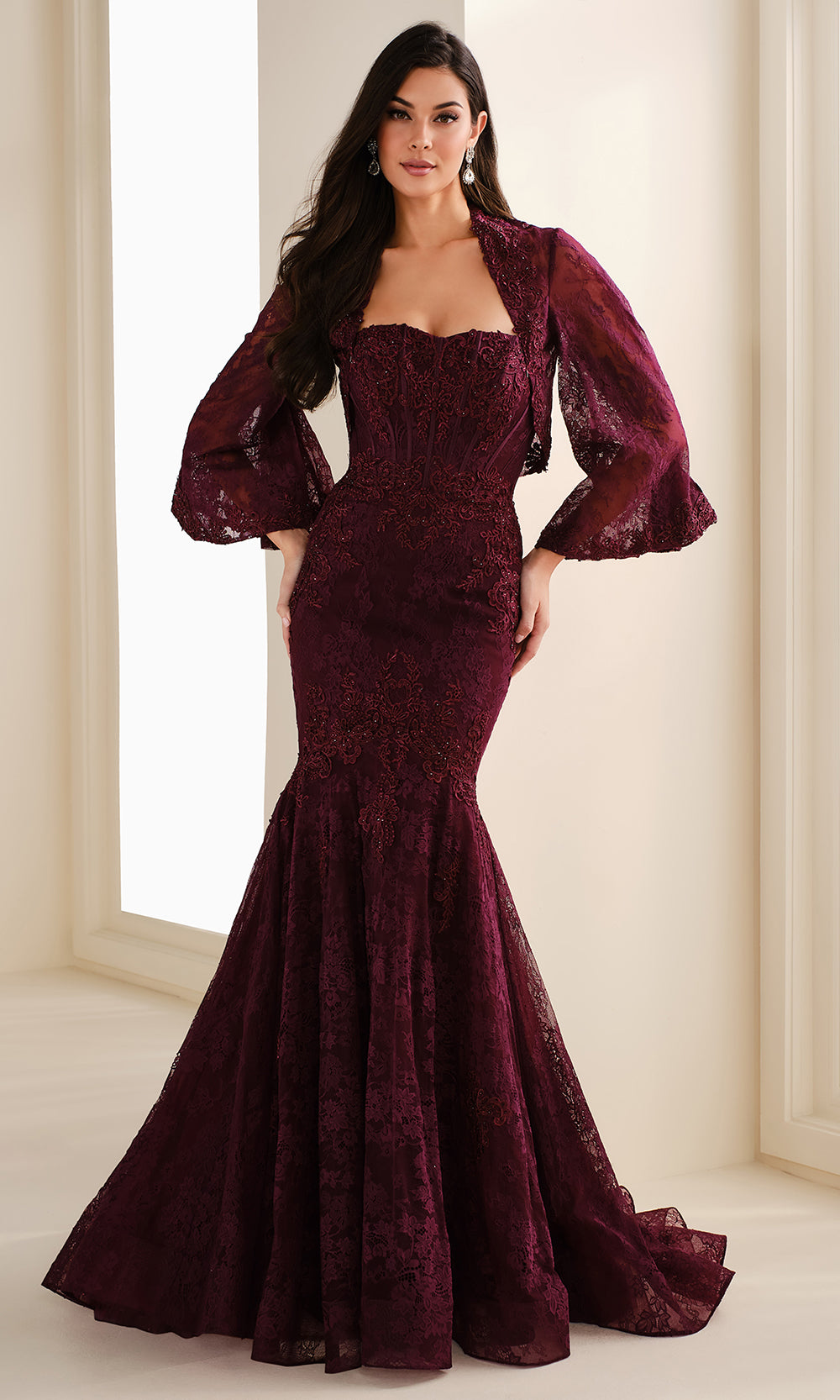 With a timeless silhouette and a touch of drama, the Ivonne D ID1403 combines classic beauty and textural flair. The strapless sweetheart neckline draws the eye to the decolletage while the trumpet skirt gracefully contours the figure. It includes a detachable sheer lace jacket with voluminous long sleeves that offer an elegant layer of sophistication. Made in floral lace with stone accents and embroidery , this gown creates a lasting impression from ceremony to celebration. Turn any special event into a couture moment with the unforgettable Ivonne D ID1403. Models are wearing Black, and Aubergine colors.