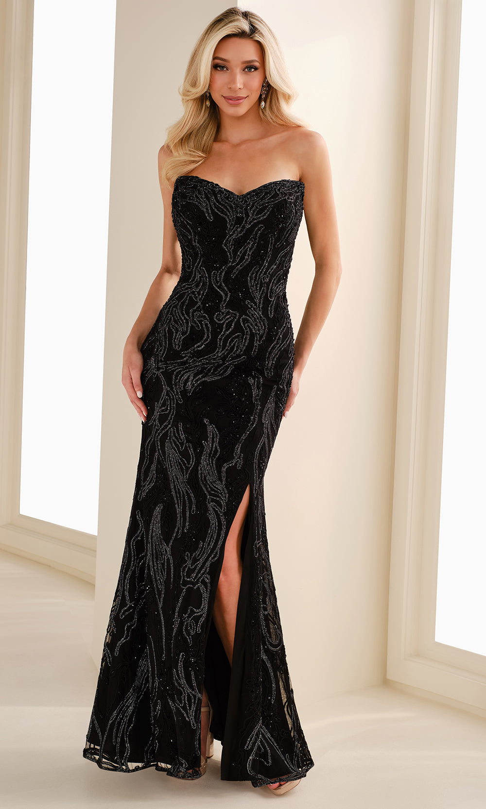 Striking design and intricate embellishment define the Ivonne D ID1404 sheath gown. With a strapless sweetheart neckline and shimmering beaded embroidery, it molds the body in all the right places. The high slit in the skirt adds a modern edge while elongating the legs for a statuesque finish. Made from soutache tulle, every inch of the gown is layered with texture and shine. Step into the spotlight with confidence and poise in the stunning Ivonne D ID1404. Models are wearing Blue Willow, Stone, and Black colors.