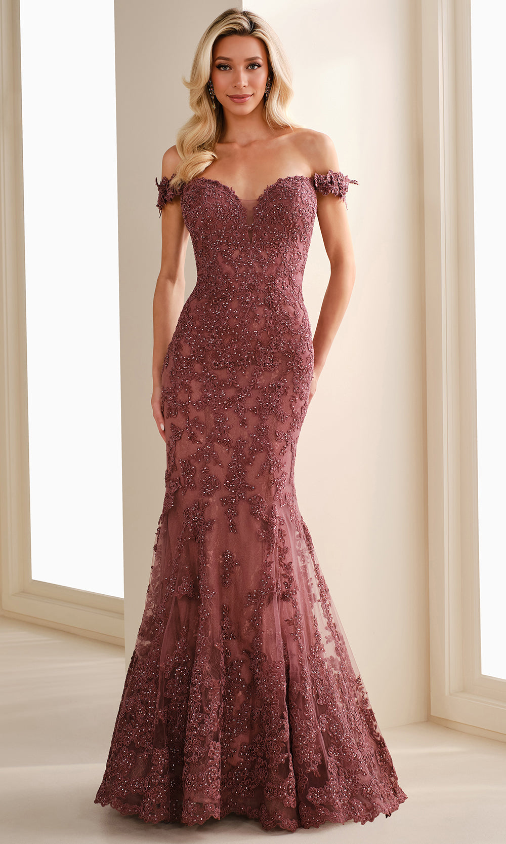 Graceful and intricately designed, the Ivonne D ID1407 gown pairs romantic lacework with soft structure. This mermaid ensemble features a sweetheart neckline and off shoulder sleeves, framed by a corded lace overlay adorned with subtle stones. The allover lace fabric adds texture and richness to the silhouette, while a matching shawl and optional three-quarter sleeves allow for varied styling. Ivonne D ID1407 is a perfect match for those who favor classic design infused with layered lace and delicate sparkle. Models are wearing Jade, Blue Willow, and Mulberry colors.