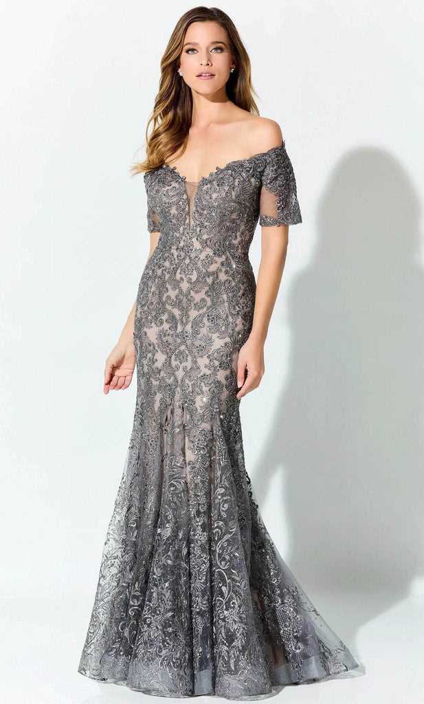 Be the loveliest of them all wearing this Ivonne D ID925 creation. Mesmerize in floral embroidery and sprinkled beadwork adorning the whole ensemble. This gown flaunts an off-shoulder neckline with a plunging v-notched and a sheer short sleeve. A zipper closure secures the mid-open back, while the mermaid skirt enhances your curves and gracefully flares to a sweeping train. The shawl is included. Flatter your finest assets as you enthrall the crowd in this Ivonne D ID925 long gown. Model is wearing the Charcoal color.