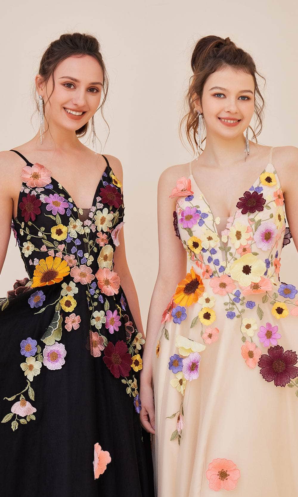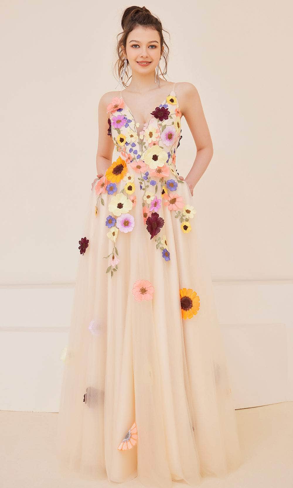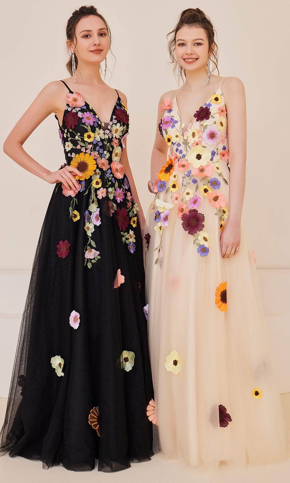 Get a glamorous look with this breathtaking dress by Jadore J21016. Makes a statement in a sleeveless, plunging V-neckline that matches at the back. Beautifully created with colorful flower appliques that fall down to the skirt, the fitted bodice also has a back zipper closure for a snug, custom fit. From the waist begins an A-line skirt with floor-length finish. This gorgeous piece by Jadore deserves a spot in your wardrobe. Models are wearing Black/Multi, and Nude/Multi colors.