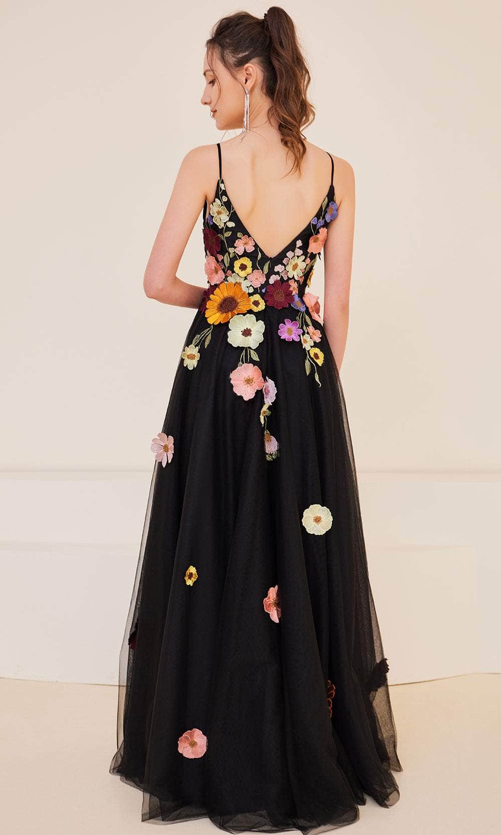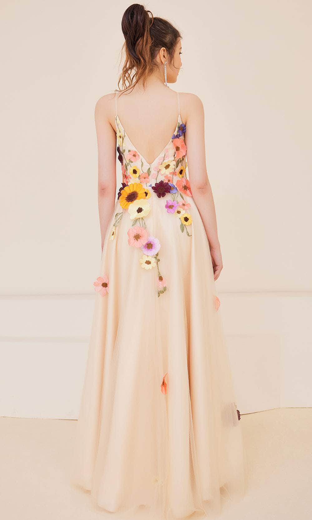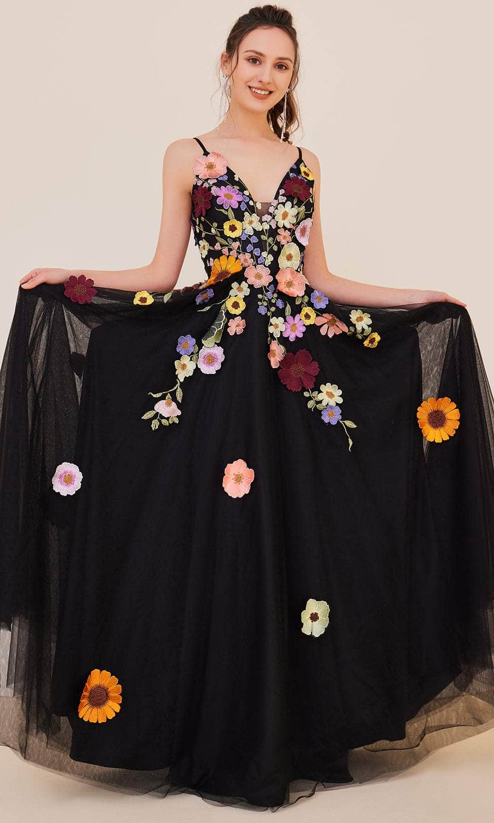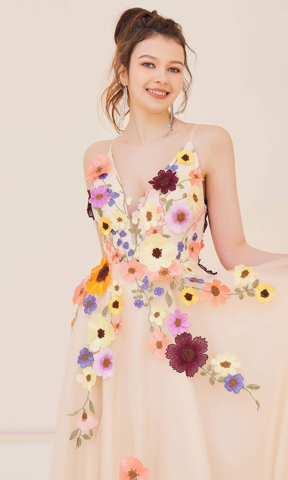 Get a glamorous look with this breathtaking dress by Jadore J21016. Makes a statement in a sleeveless, plunging V-neckline that matches at the back. Beautifully created with colorful flower appliques that fall down to the skirt, the fitted bodice also has a back zipper closure for a snug, custom fit. From the waist begins an A-line skirt with floor-length finish. This gorgeous piece by Jadore deserves a spot in your wardrobe. Models are wearing Black/Multi, and Nude/Multi colors.