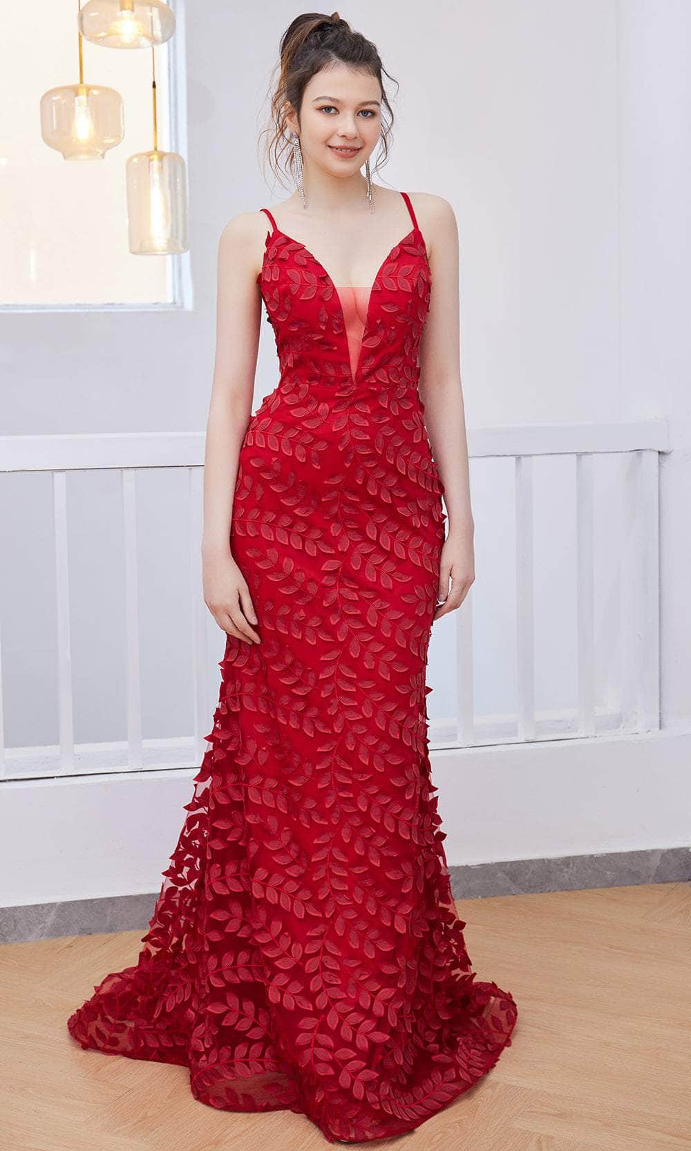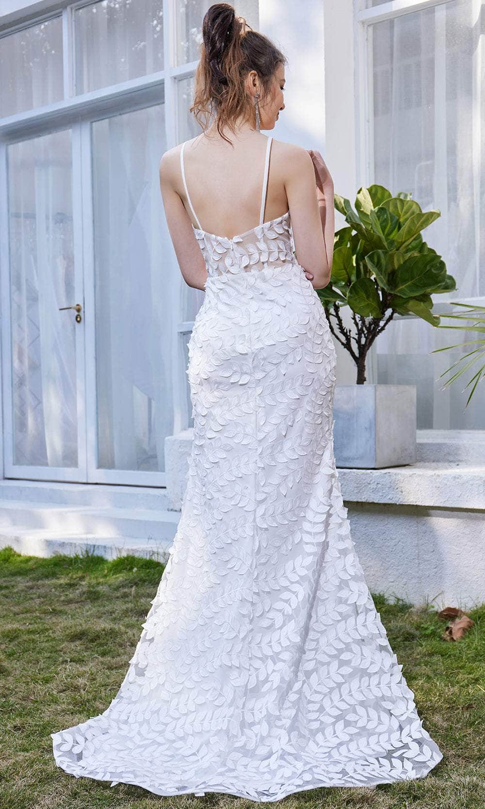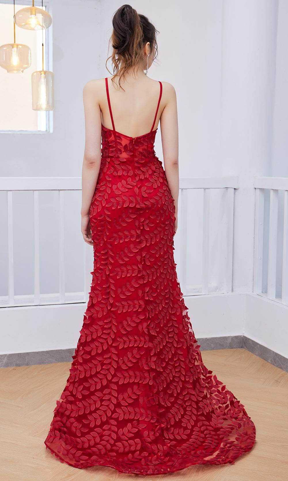 J'Adore Dresses J21037 - V-neck Leaf Applique Long Dress