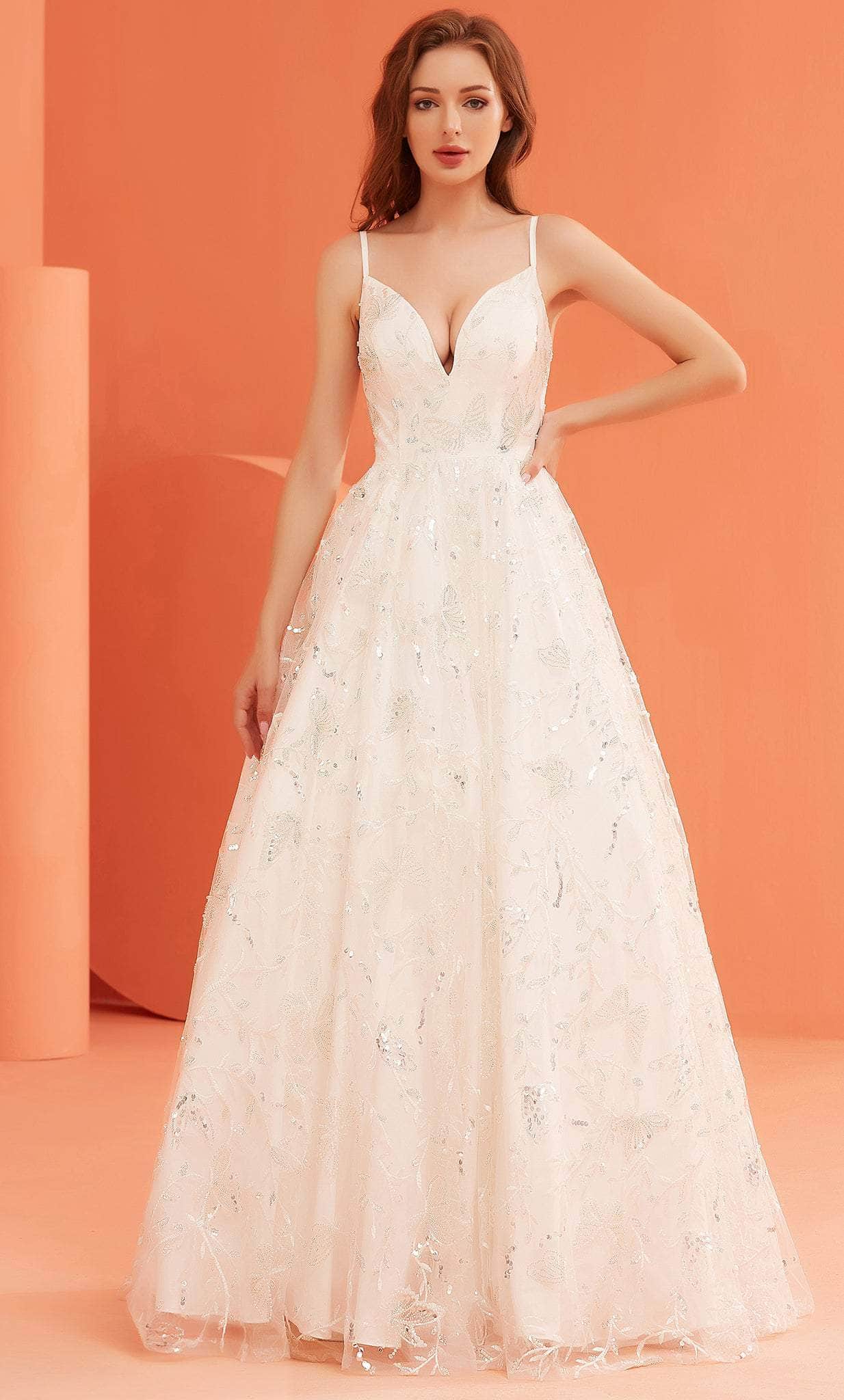 In this creation by J'Adore Dresses J22038, walk-in glitz and make all eyes turn to you. Crafted with glamorous embroideries, this winning piece features a V-neckline with a sleeveless bodice supported with spaghetti straps. Revealing a lace-up back for a perfect fit with a center zipper closure at the back of an A-line skirt that gorgeously sculpts and flares into a sweep train. J'Adore Dresses J22038 will take your beauty to the next level. Models are wearing Ivory, Steal Blue and Tea rose colors