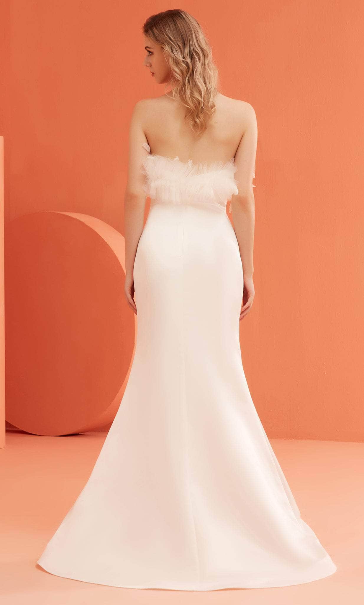 | Details: | Strapless, Organza ruffles, Crepe, Fitted bodice, Minimalist, Low back, Back zipper, Floor length, Sweep train |