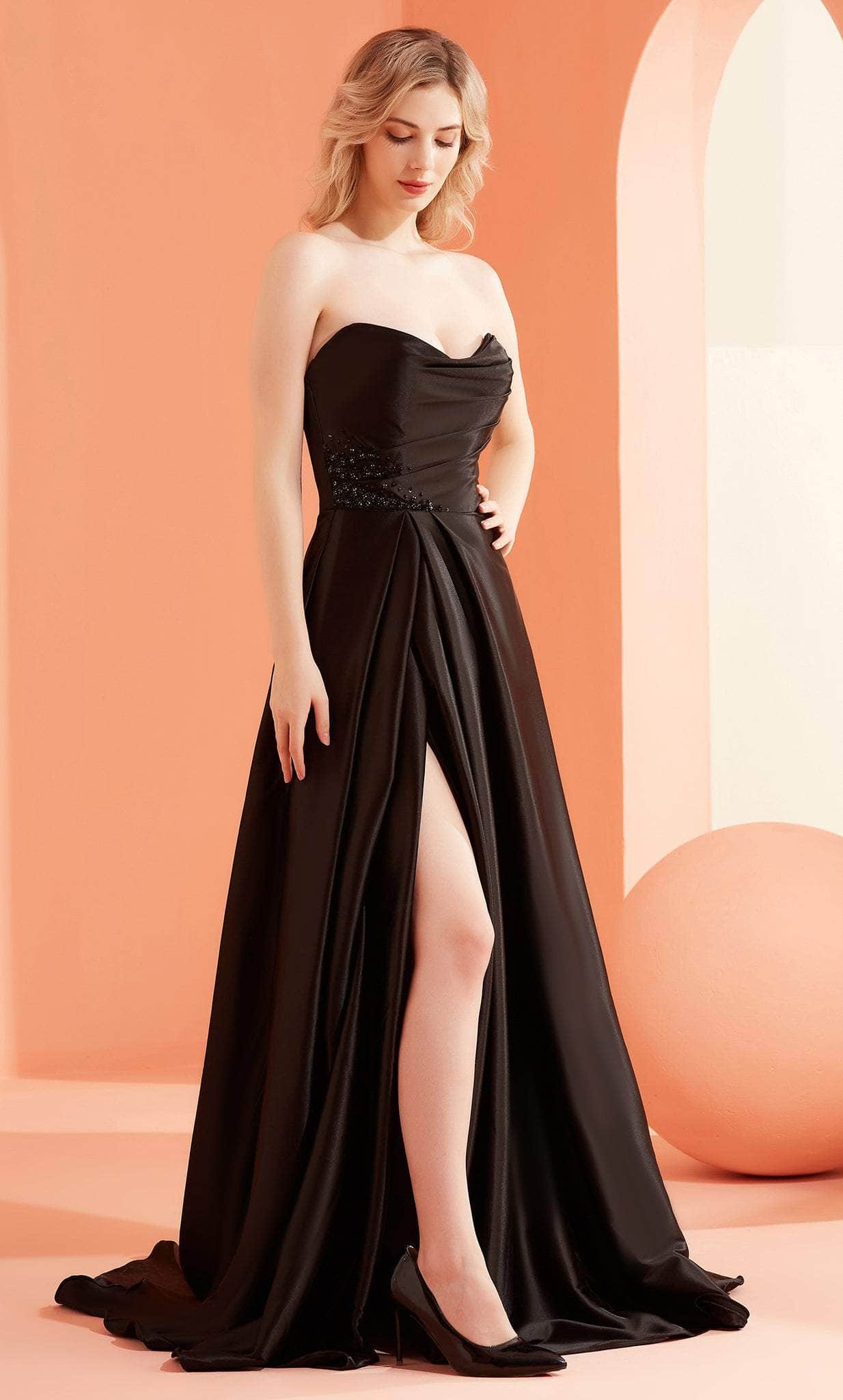 | Details: | Strapless. Ruched Detail Bodice, Embellished Side, Slit, Train, Back Zipper Closure |