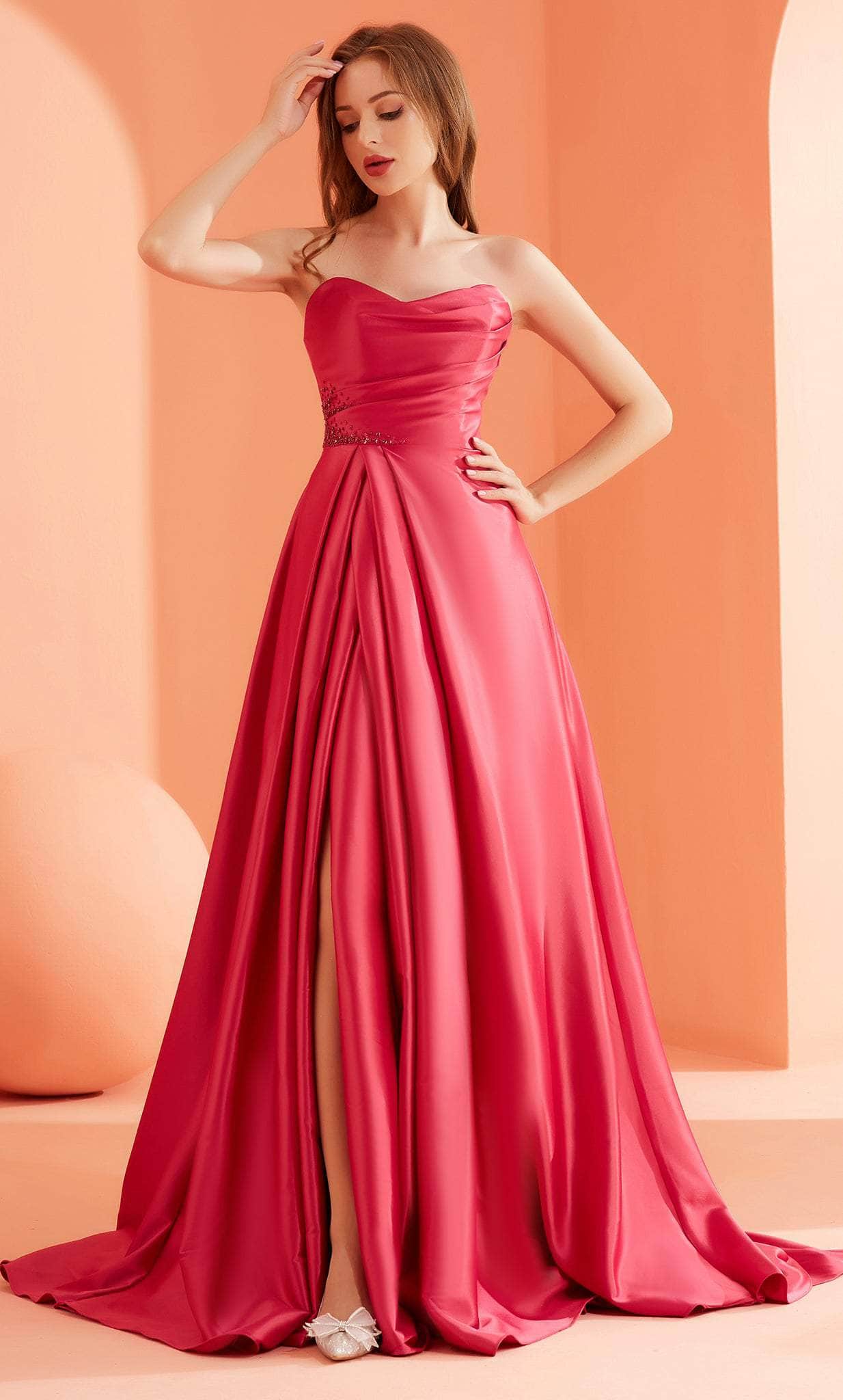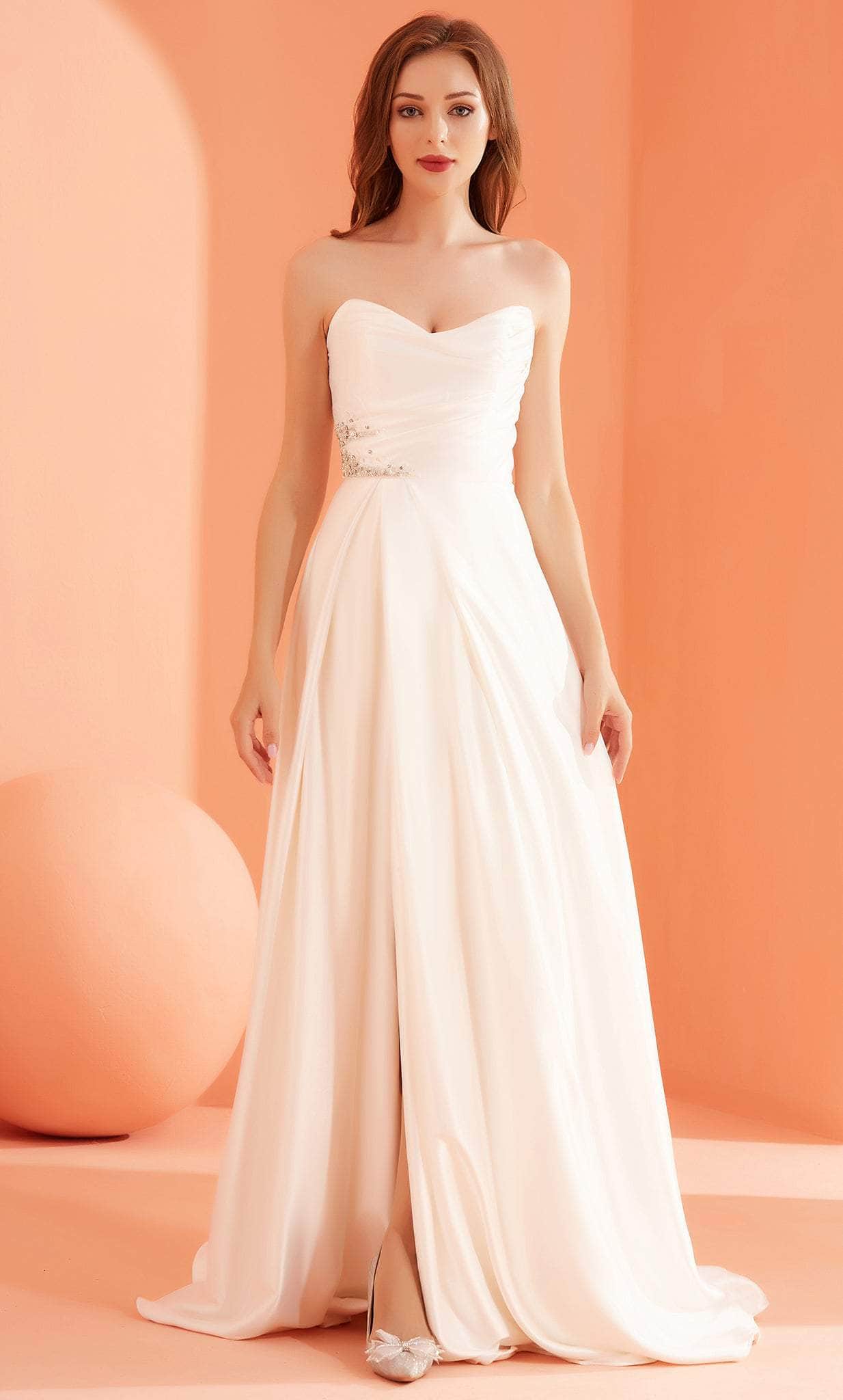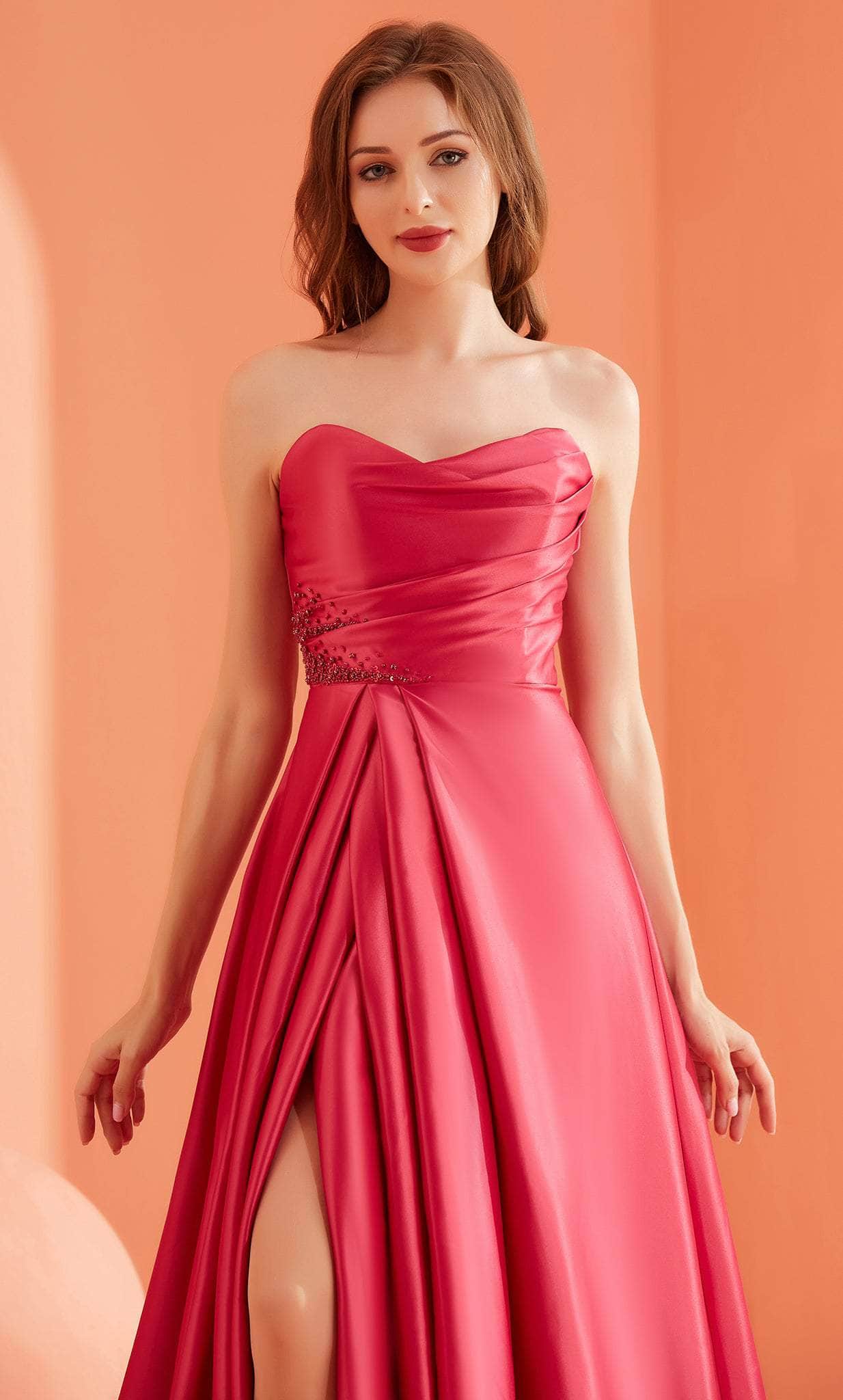 Be unique and grab attention in this stunning J'Adore Dresses J22053 creation. This winning piece is beautifully tailored from satin fabric and offers a strapless bodice crowned with a sweetheart neckline. The back is secured with a center zipper closure. Ruched details and a side bead embellishment are truly eye-catching features. A side slit brings an elegant touch to the full-length A-line skirt with a sweep train finish. Create an unforgettable elegance in this J'Adore Dresses J22053 creation. Models are wearing Black, Hot Pink, and Ivory colors.
