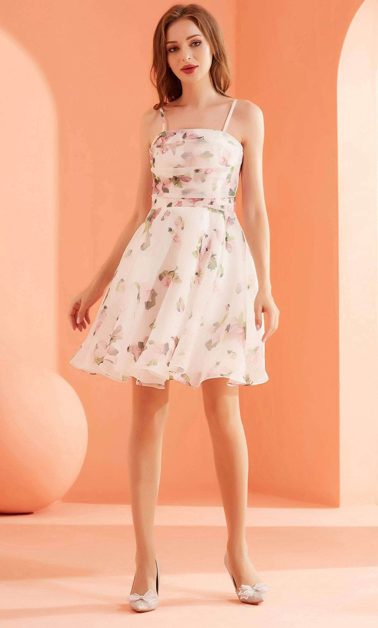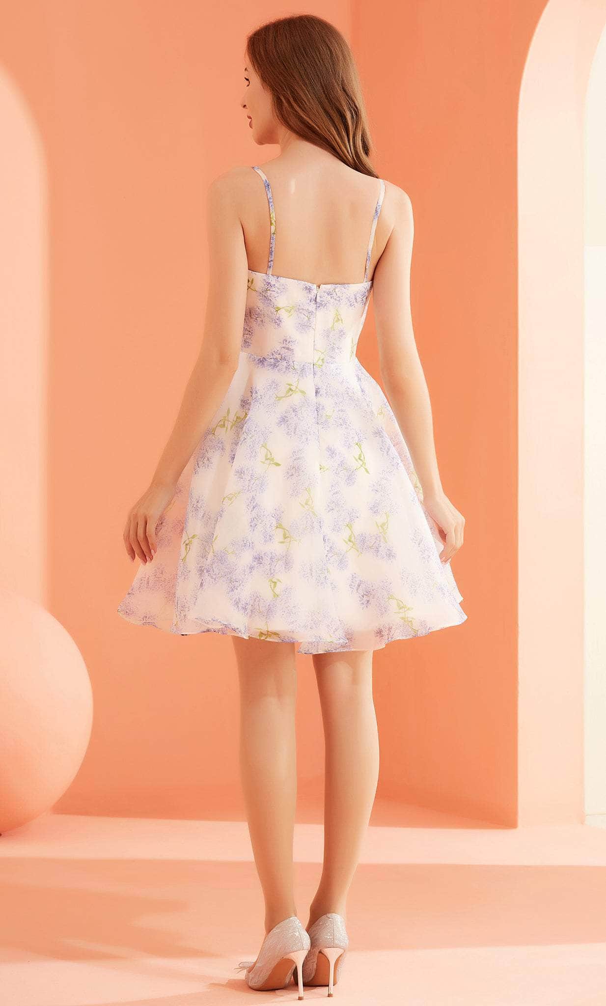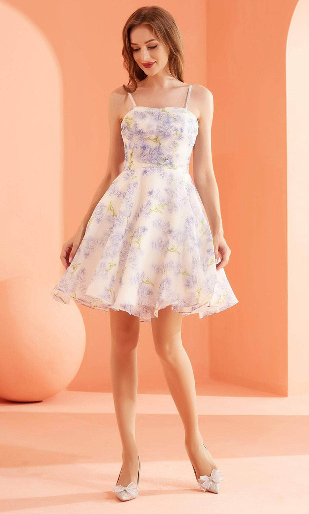 Go for a timeless and sophisticated look wearing this prominent dress by J'Adore Dresses J22076. Has thin straps and a straight neckline, and the fabric is covered in a lavender design. Giving the wearer that laid-back, easy-going vibe. The skirt has a flowy vibe and the A-line silhouette is made in a short length. The dress is secured in the back with a zipper. Fall in love when you slip on this J'Adore Dresses J22076 dress. Models are wearing Lavender and Rose colors.
