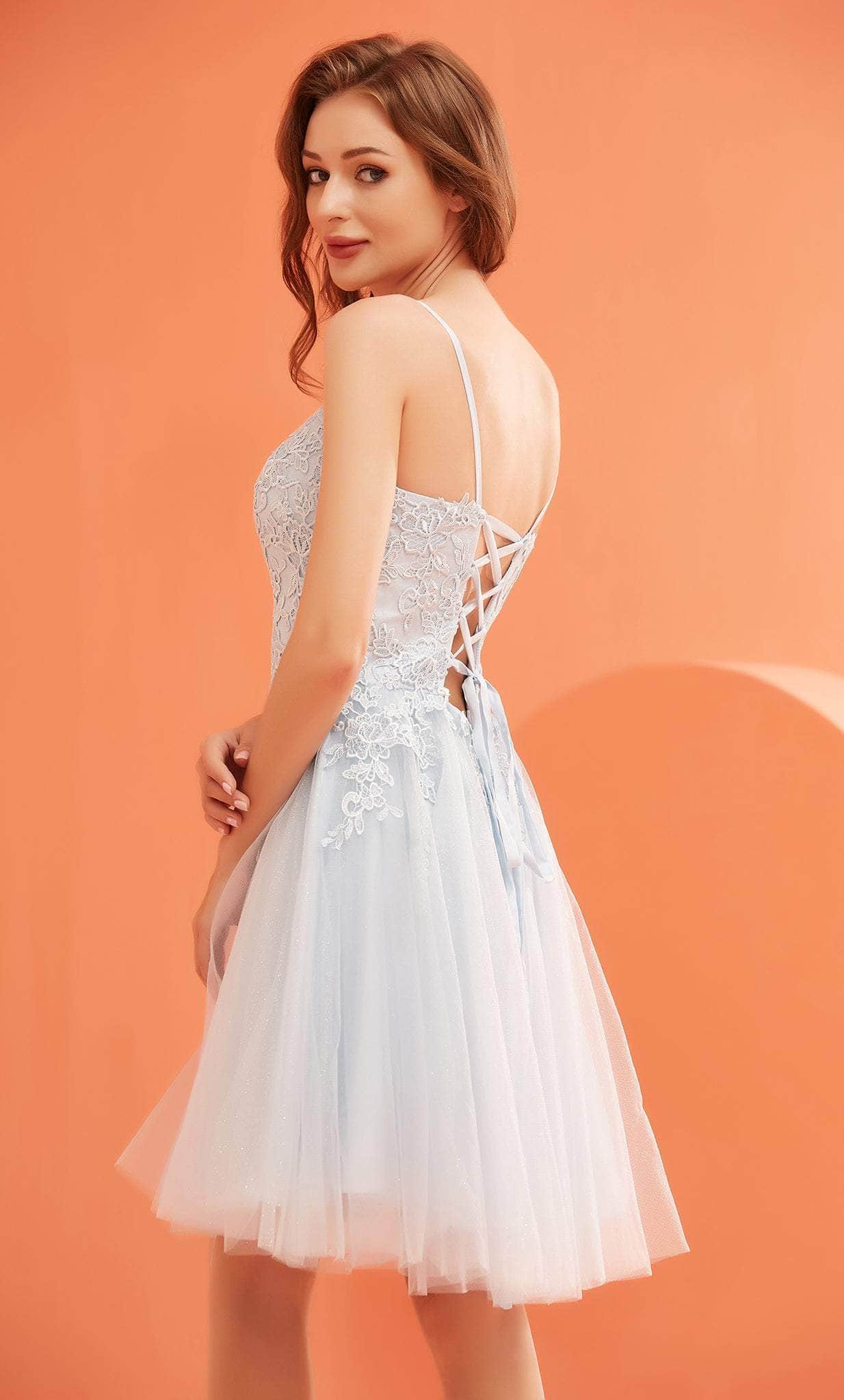 Surround yourself with decadence in a dazzling dress from J'Adore Dresses J22080. This dress's use of thin straps and plunging V neckline, together with its elaborate embroidered accents down the body, give it a romantic appearance. Has glitters that shimmer all around, and the tulle used to create the A-line skirt. The back is strapped and fastens with a lace tie. J'Adore Dresses J22080 you'll surely be able to dance all night long! Models are wearing Dove and Navy colors.