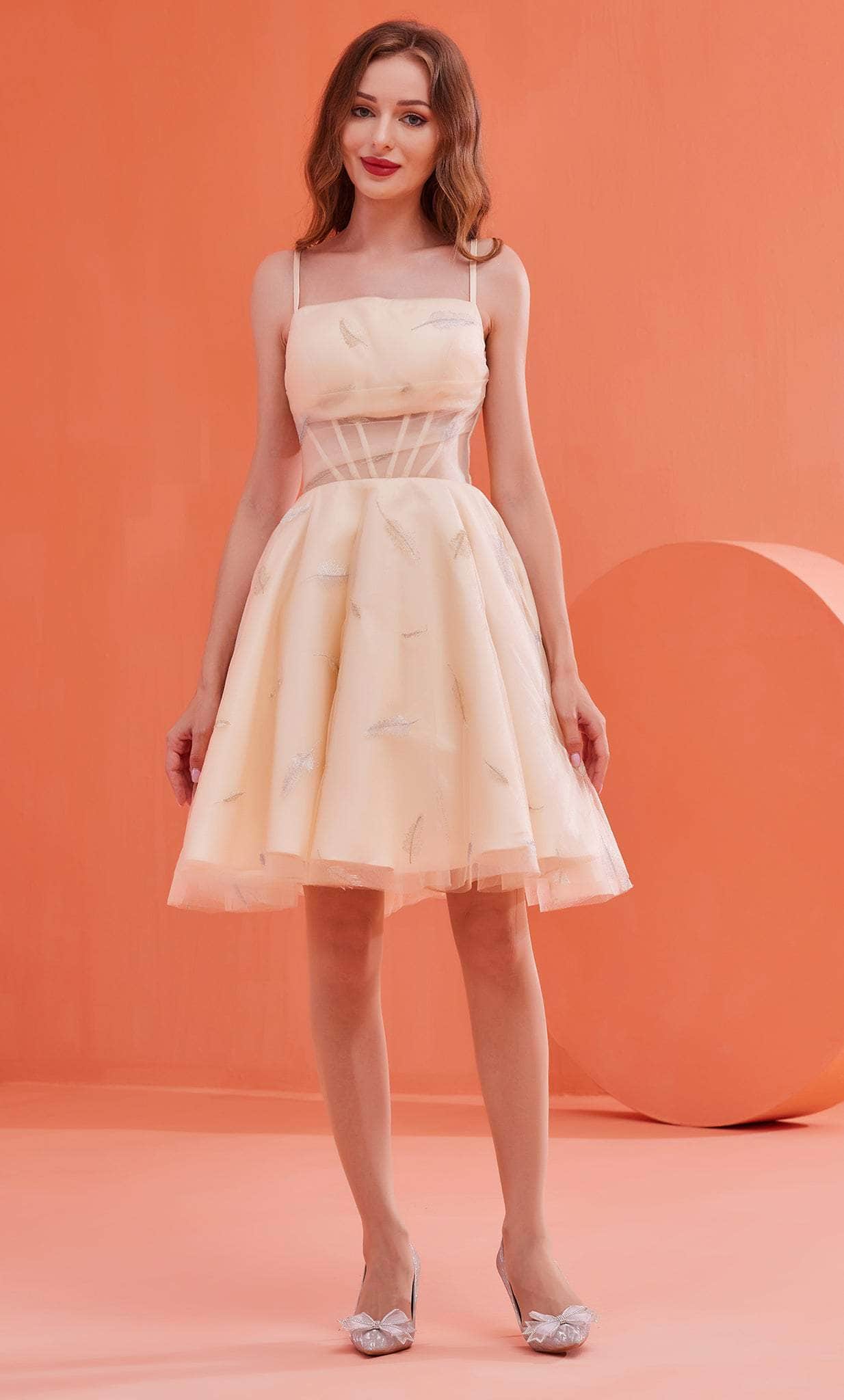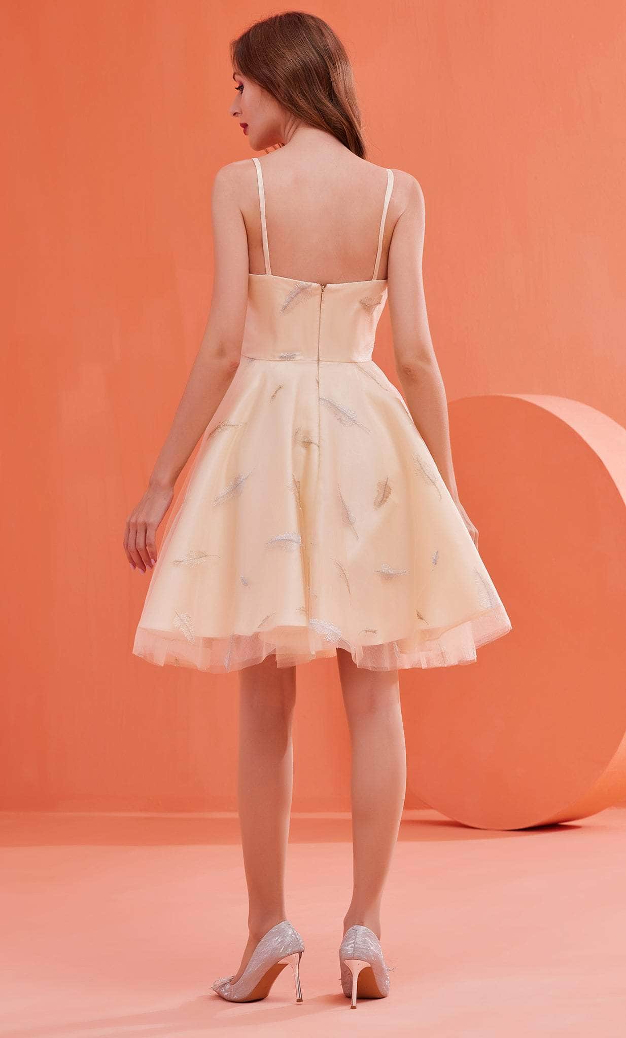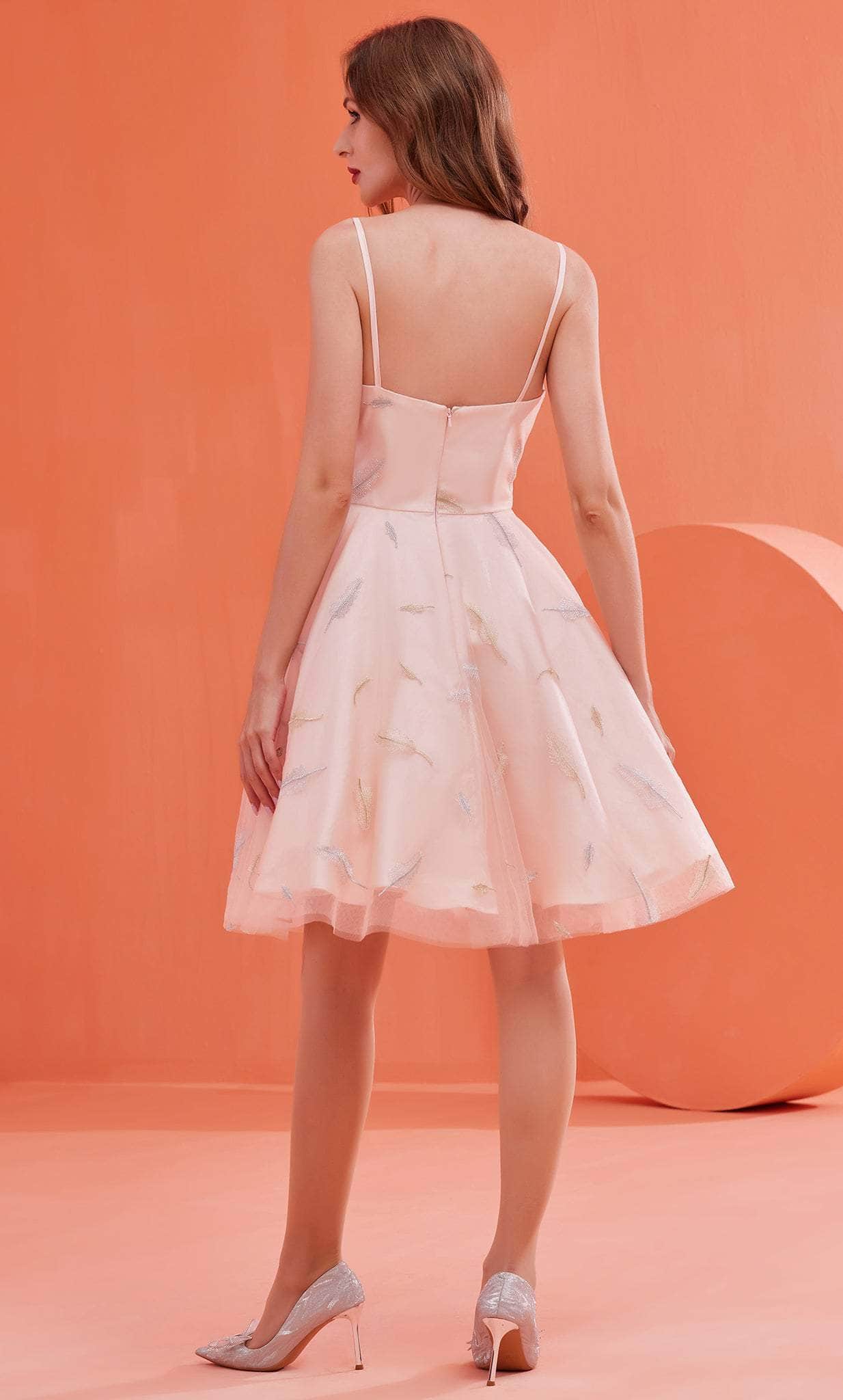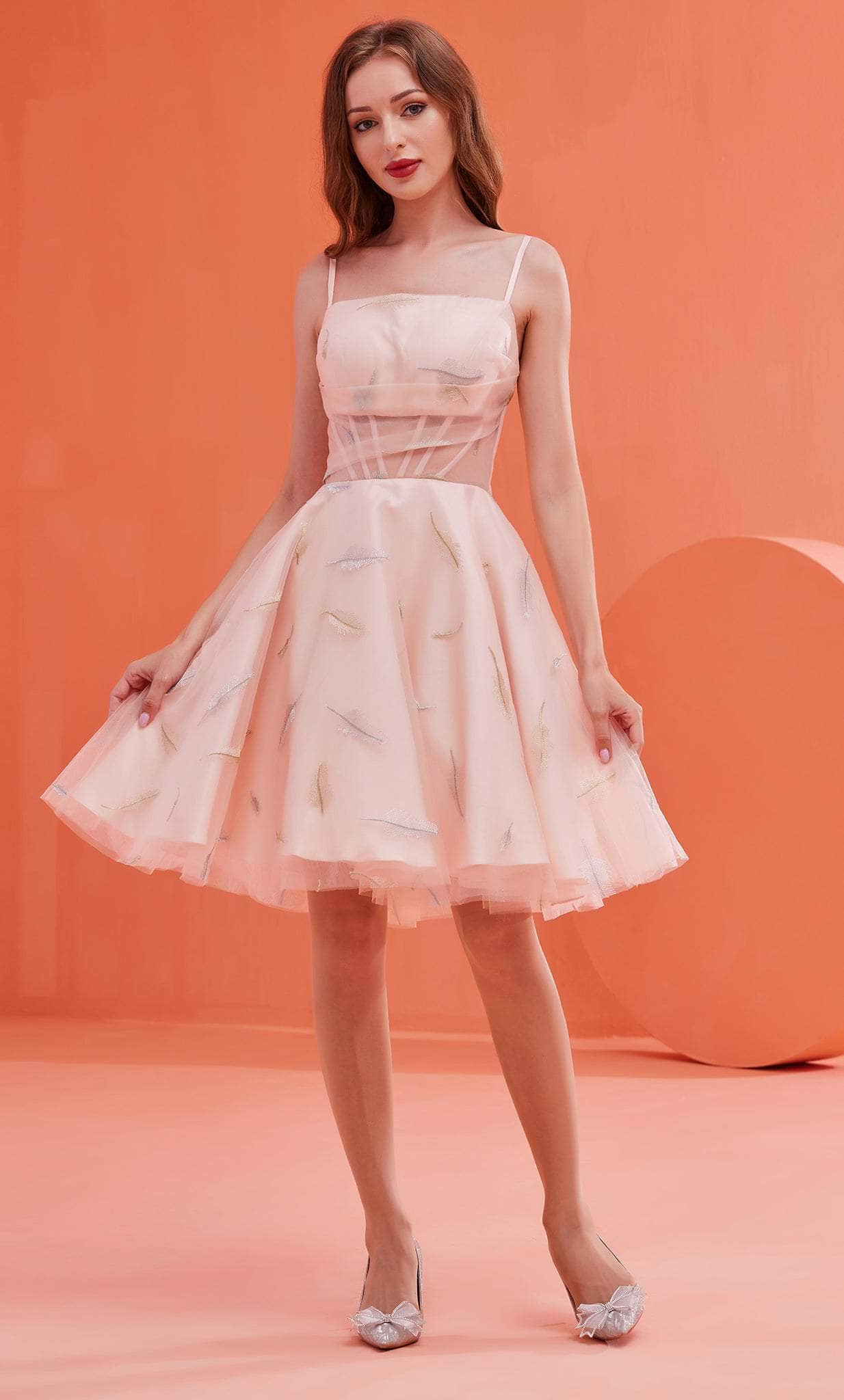 Look your absolute best and create a night that you will never forget with J'Adore Dresses J22082. Contours your figure with corset bodice and fashions a straight across neckline and thin straps. Has an A-line silhouette skirt that shows off full volume in a length that is just right above the knee. Has embroidery details of feather patterns attached all over the dress. Make them look in this lavish dress by J'Adore Dresses J22082. Model is wearing Pink color.