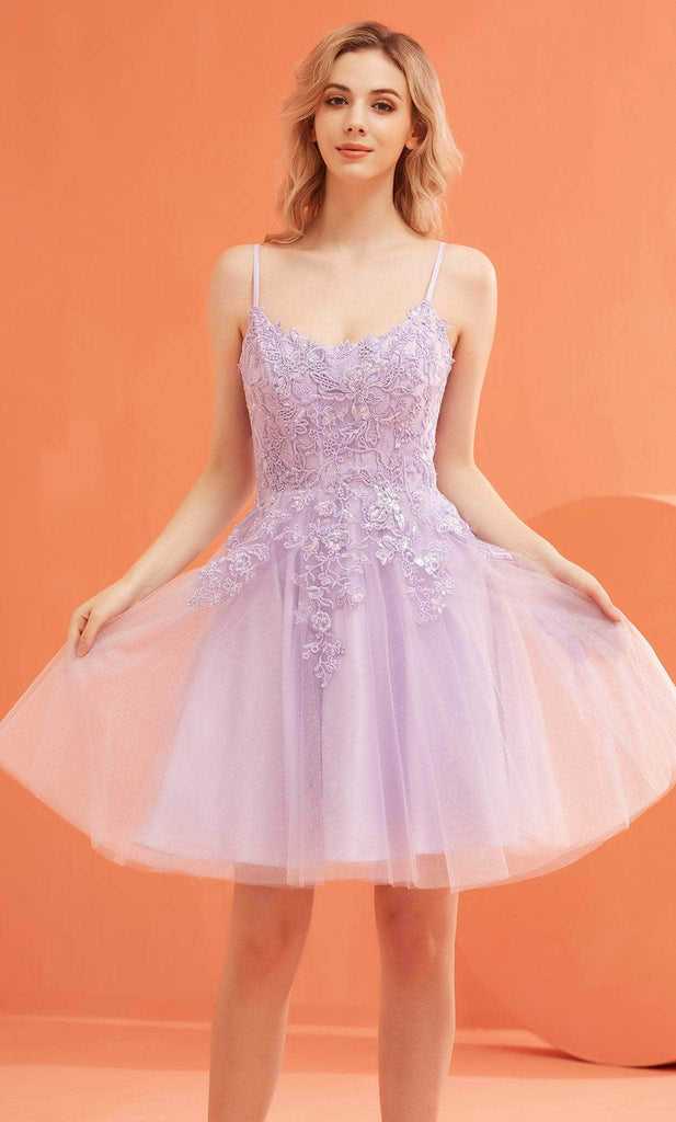 Be the spectacular belle on your next formal event in this dress from J'Adore Dresses J228086. Show off your sweet style with this sleeveless short A-line dress that uses spaghetti straps to highlight the scoop-shape neckline. Has embroidery details running along the bodice and a shimmering glittered skirt. At the back is a zipper for security and closure. This J'Adore Dresses J228086 is sure to make you the darling of the party! Models are wearing Light Blue and Violet colors.
