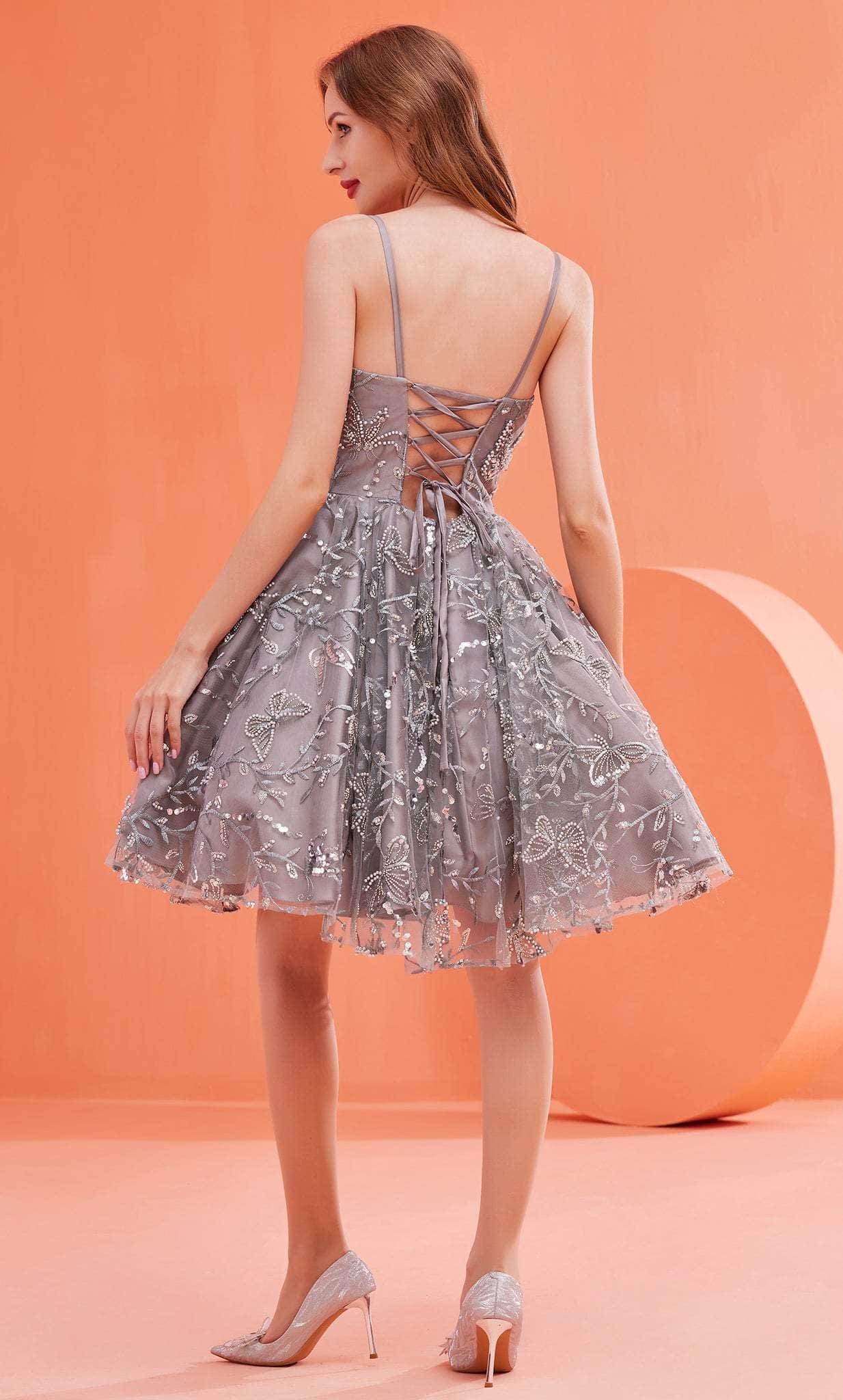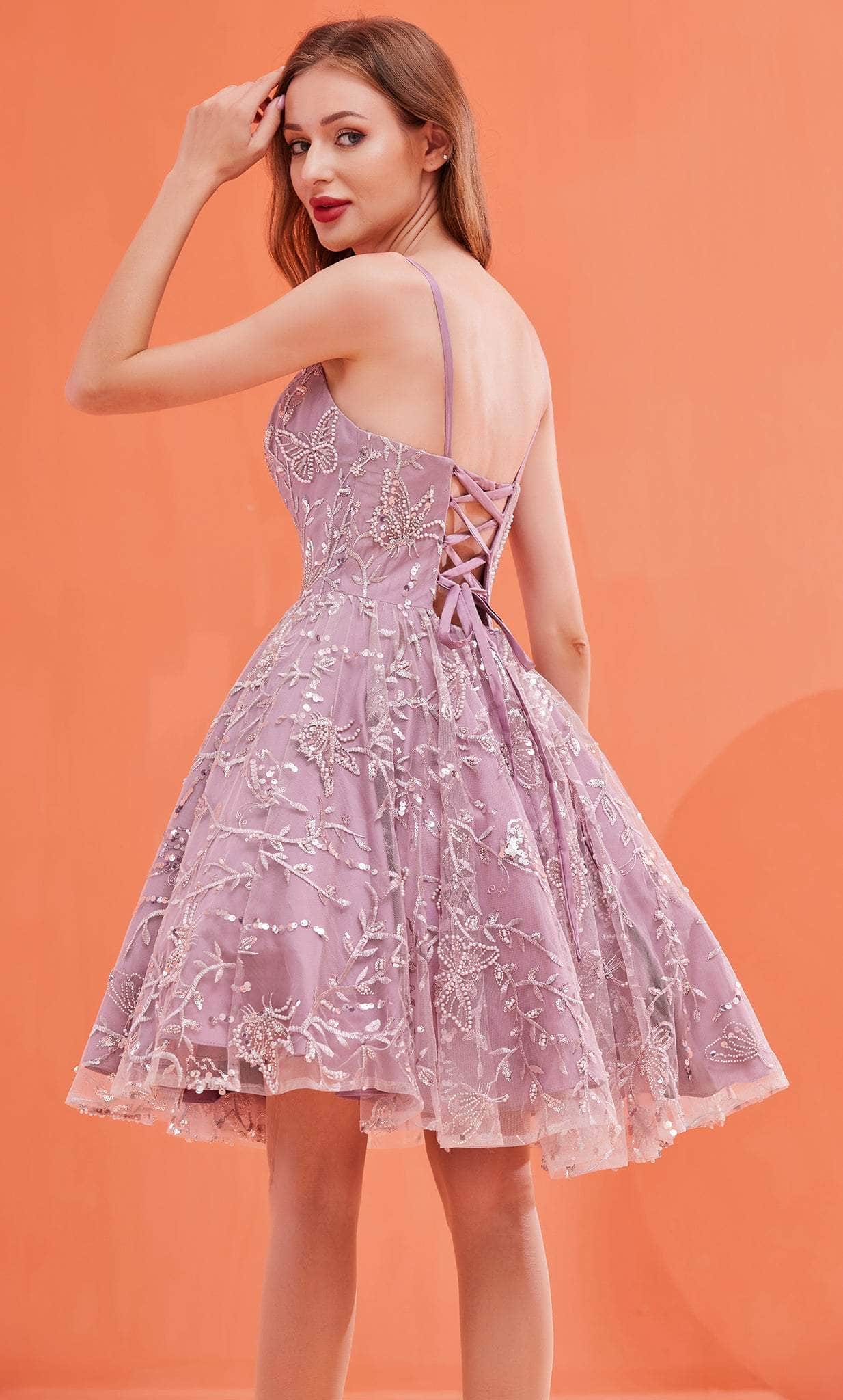 Show your sophisticated sense of style in this J'Adore Dresses J22087. This piece has eye-catching embellishments connected to it in the shape of butterflies made of pearls, sequins, and beads. Features a short, voluminous A-line silhouette that gives off a sassy, charming feel. The dress's lace-up back is secured by the thin straps that continue there. Additionally, it has a deep V neckline. Sway to the music on your special night in this mellifluous evening set by J'Adore Dresses J22087. Model is wearing Tea Rose color.