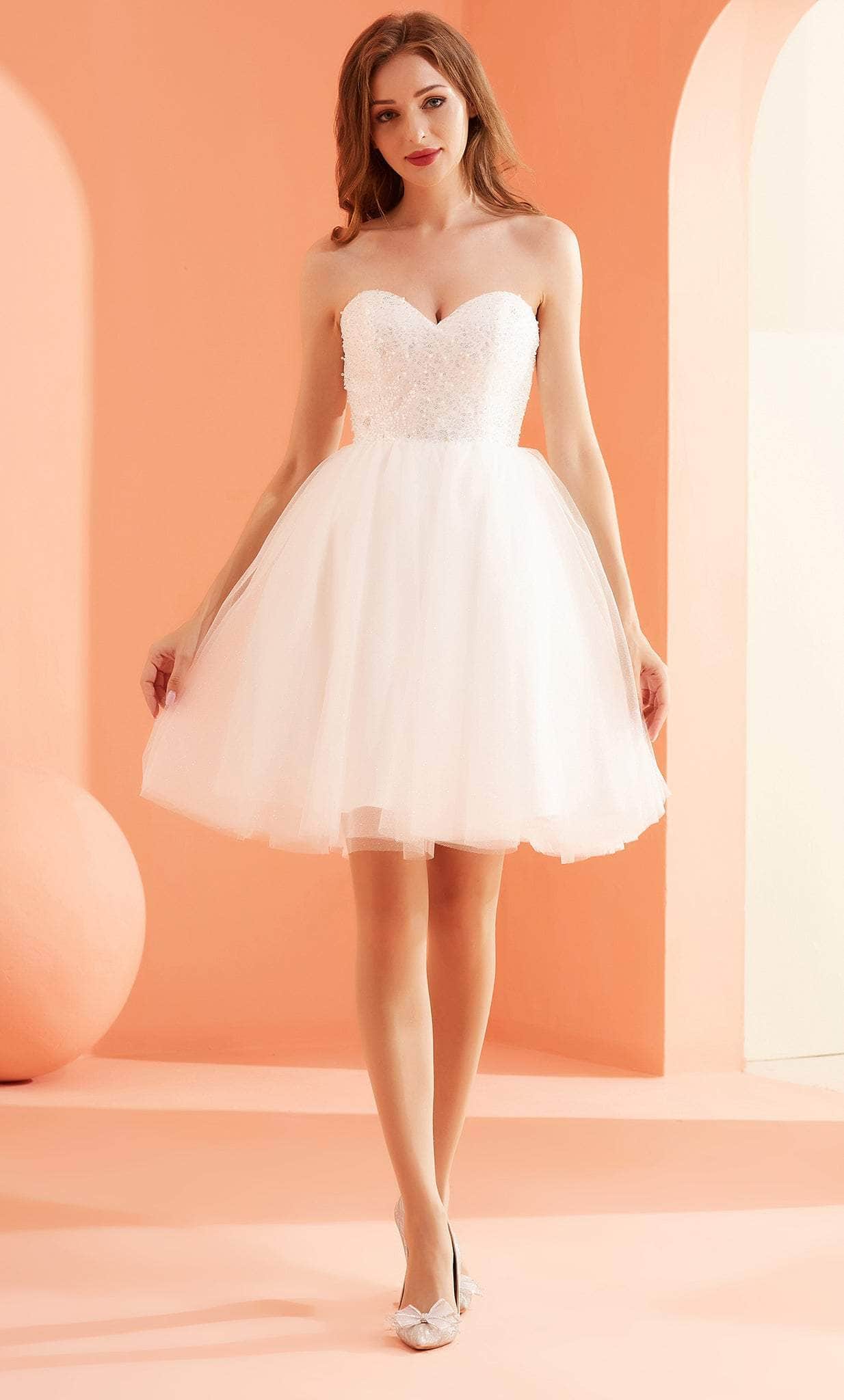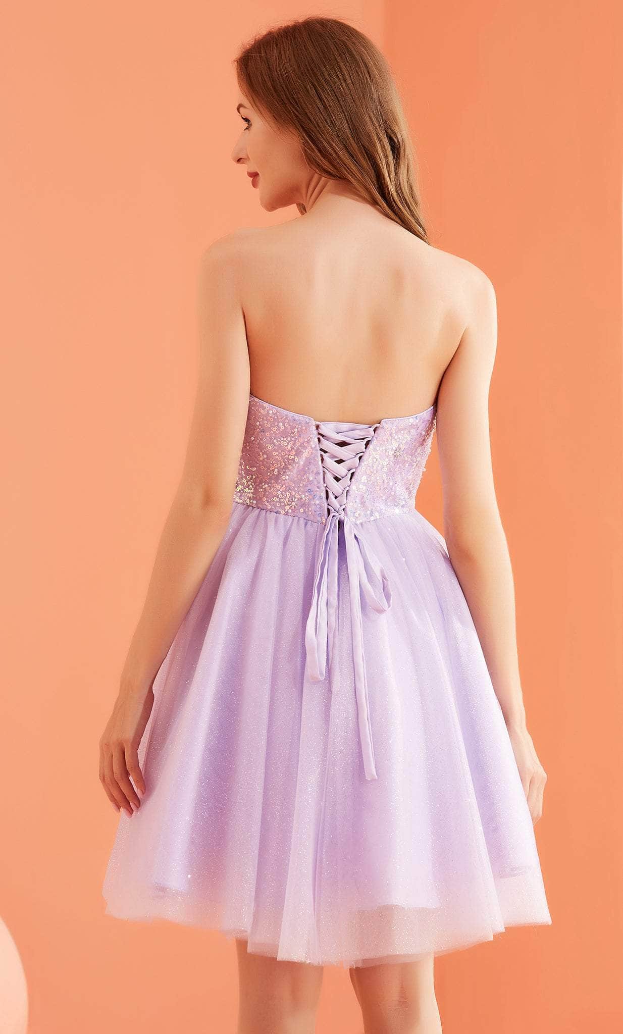 J'Adore Dresses J22089 gives you a feminine look fit for any special occasion. The bodice of this shimmering dress is embellished with bugle beads and sequins, and it has a sweetheart neckline with no straps. Gives off a feminine vibe because to its full volume silhouette and short-length tulle fabric. A lace-up tie holds the dress in place. This J'Adore Dresses J22089 is sure to make you the darling of the party! Models are wearing Very Peri and Violet colors.