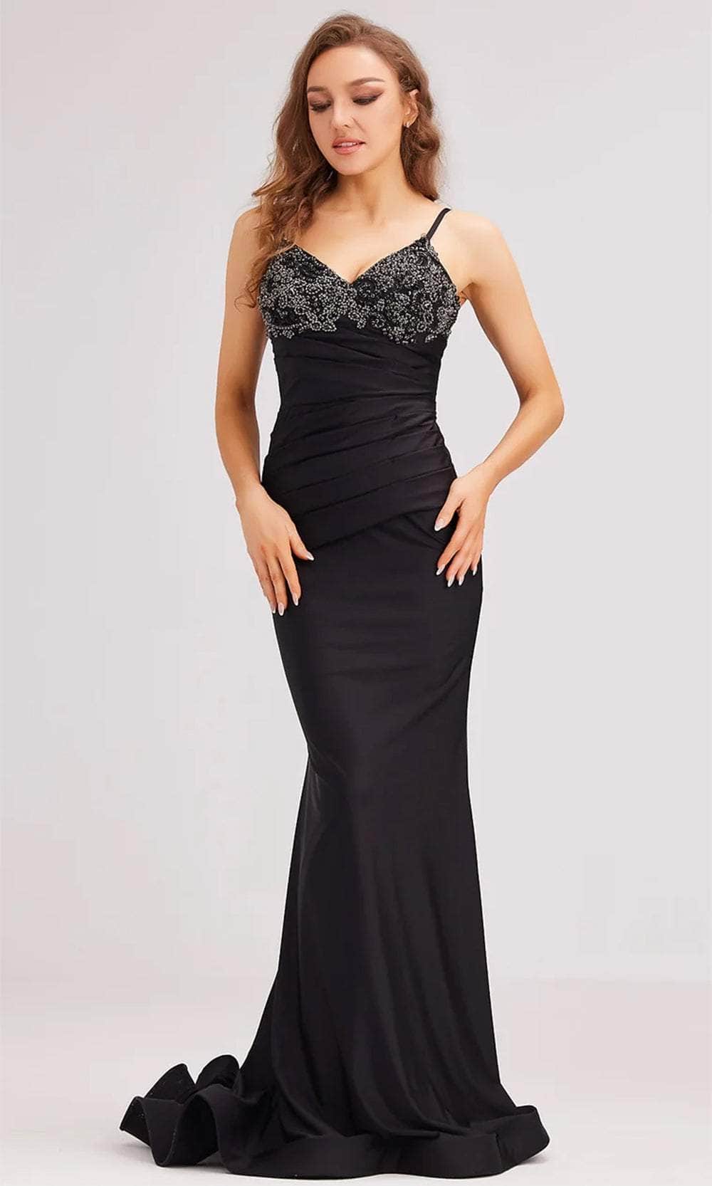 Walk in glamour with this Jadore J23004 gown radiates elegance with rhinestone embellishments around the bust. It features a sleeveless fitted bodice with ruched detailing and a V-neckline. A center zipper closure at the mid-open back ensures a perfect fit. The floor-length skirt parades in a stunning trumpet silhouette, ending with a graceful train. This exquisite Jadore J23004 blends timeless sophistication and modern allure, making it perfect for making a memorable entrance at any special event. Models are wearing Black, Maroon, and Emerald colors.