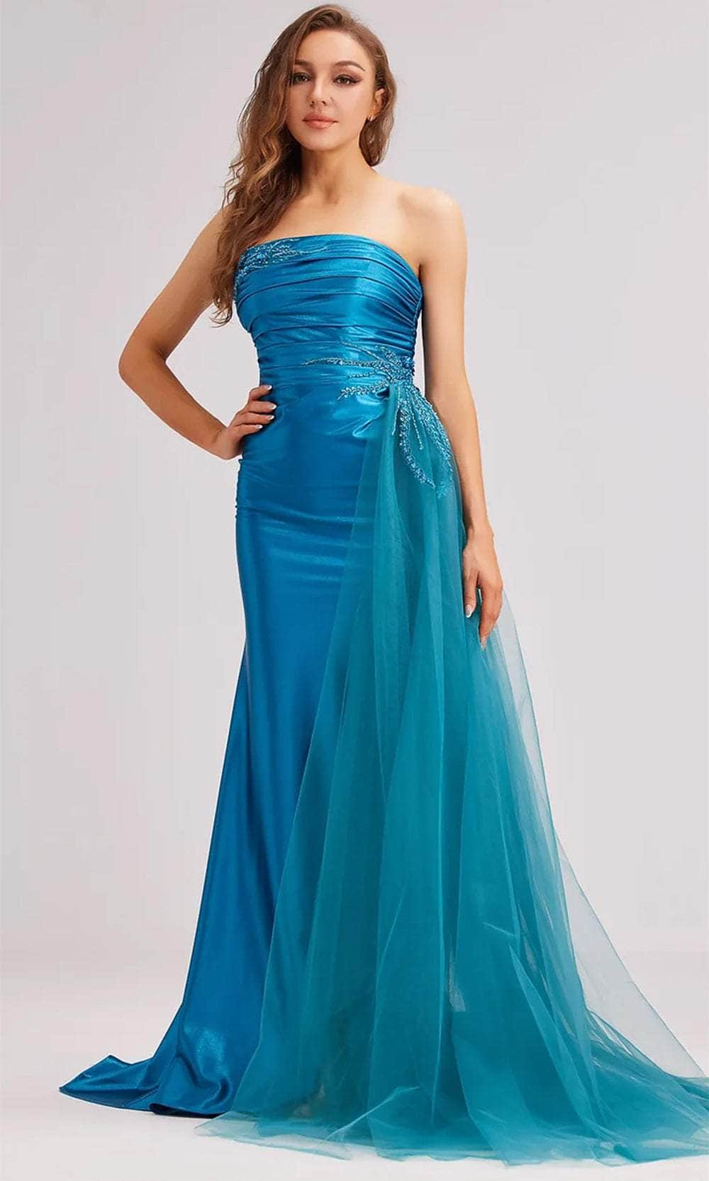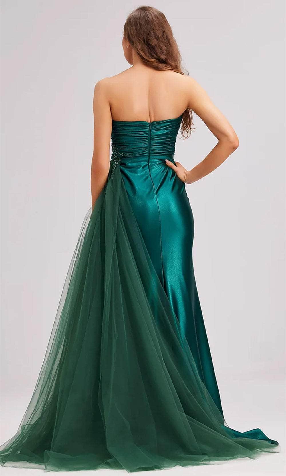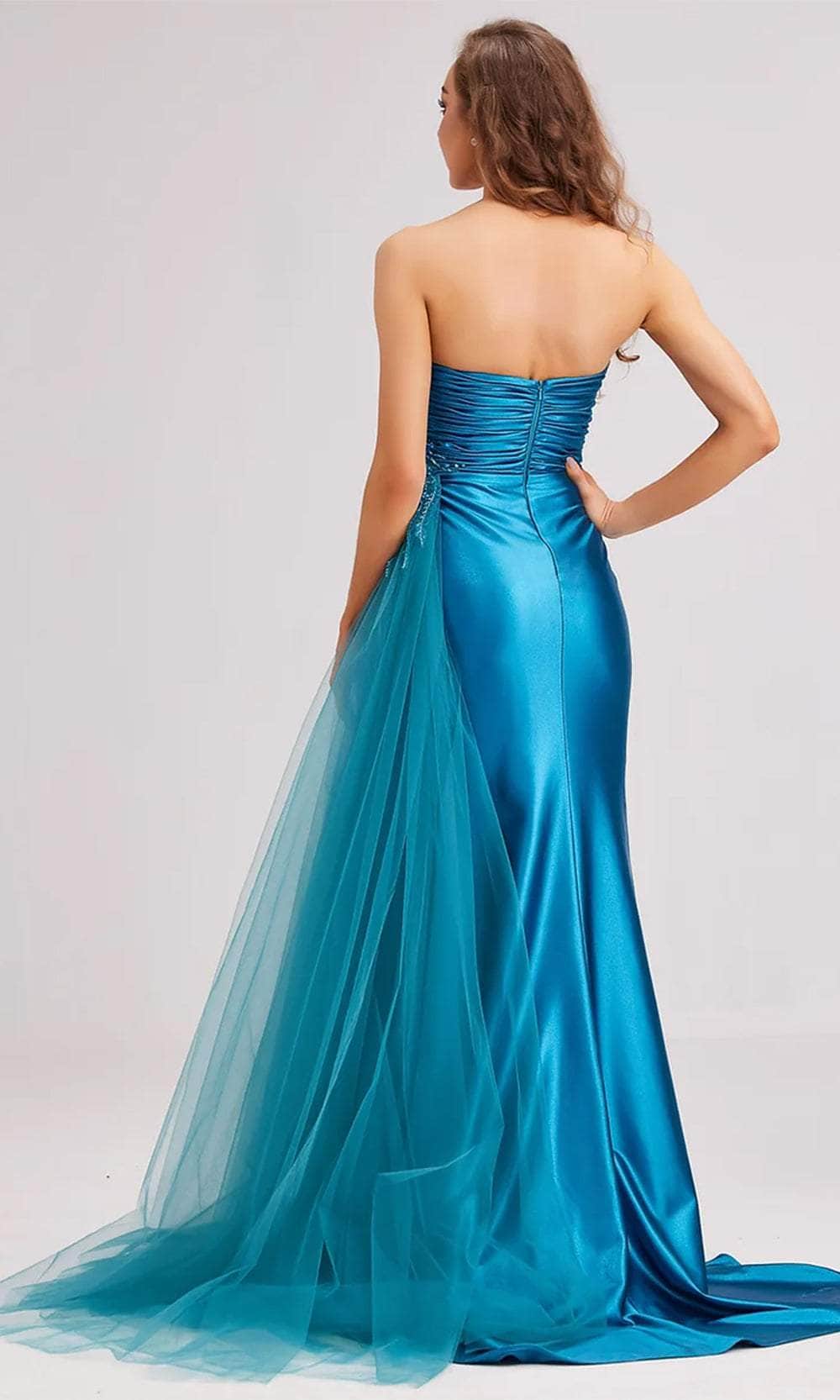 | Details: | Feather Detail, Fitted Bodice, Sleeveless, Cummerbund, Ruched, Mid-Open Back, Center Zipper Closure, Slit, Train |