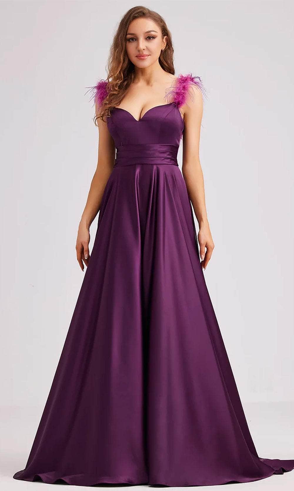 Let all heads turn on you in this Jadore J23008 gown captivated with feather embellishments around the shoulders. It features a sleeveless fitted bodice with a cummerbund that cinches the empire waistline and a sweetheart neckline. A center zipper closure at the mid-open back ensures a perfect fit. The floor-length skirt flows in a sleek sheath silhouette, accented with a daring slit and finishing with an elegant train. This stunning Jadore J23008 exudes sophistication and modern allure, perfect for any special event. Models are wearing Ash Green, Magenta, and Plum colors.