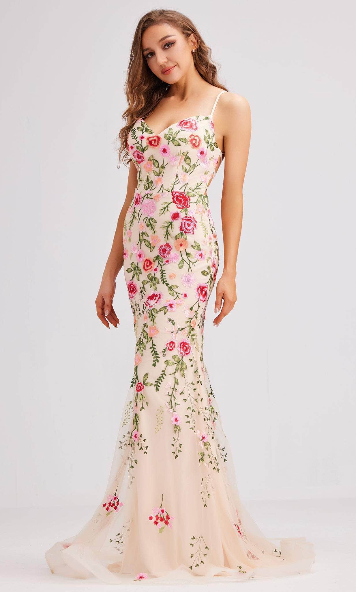 Look smoking hot while exuding drama and style in this gorgeous J'Adore Dresses J23018 creation. Designed with seam tailored lining and overlaid with a beautifully embroidered fabric, this multi-colored stunner parades a v-neckline and stringed with spaghetti straps. Adorned with blossoms accenting the tulle, this gorgeous piece shows off a lace up design on an open back. The mermaid skirt flatteringly cascades into a sweeping denouement. Mesmerize everyone when you make an entrance at your event in this dainty J'Adore Dresses J23018 masterpiece. Models are wearing the Blue Floral and Pink Floral colors.