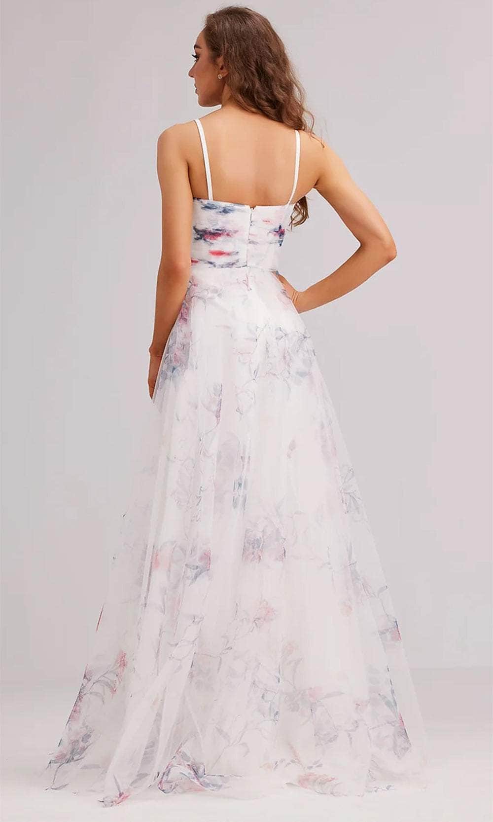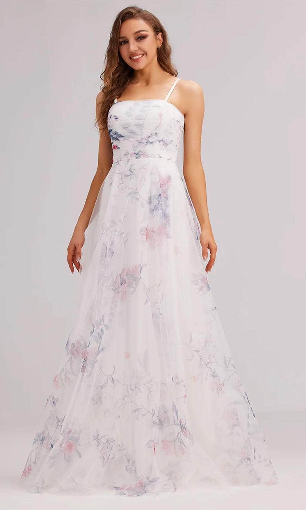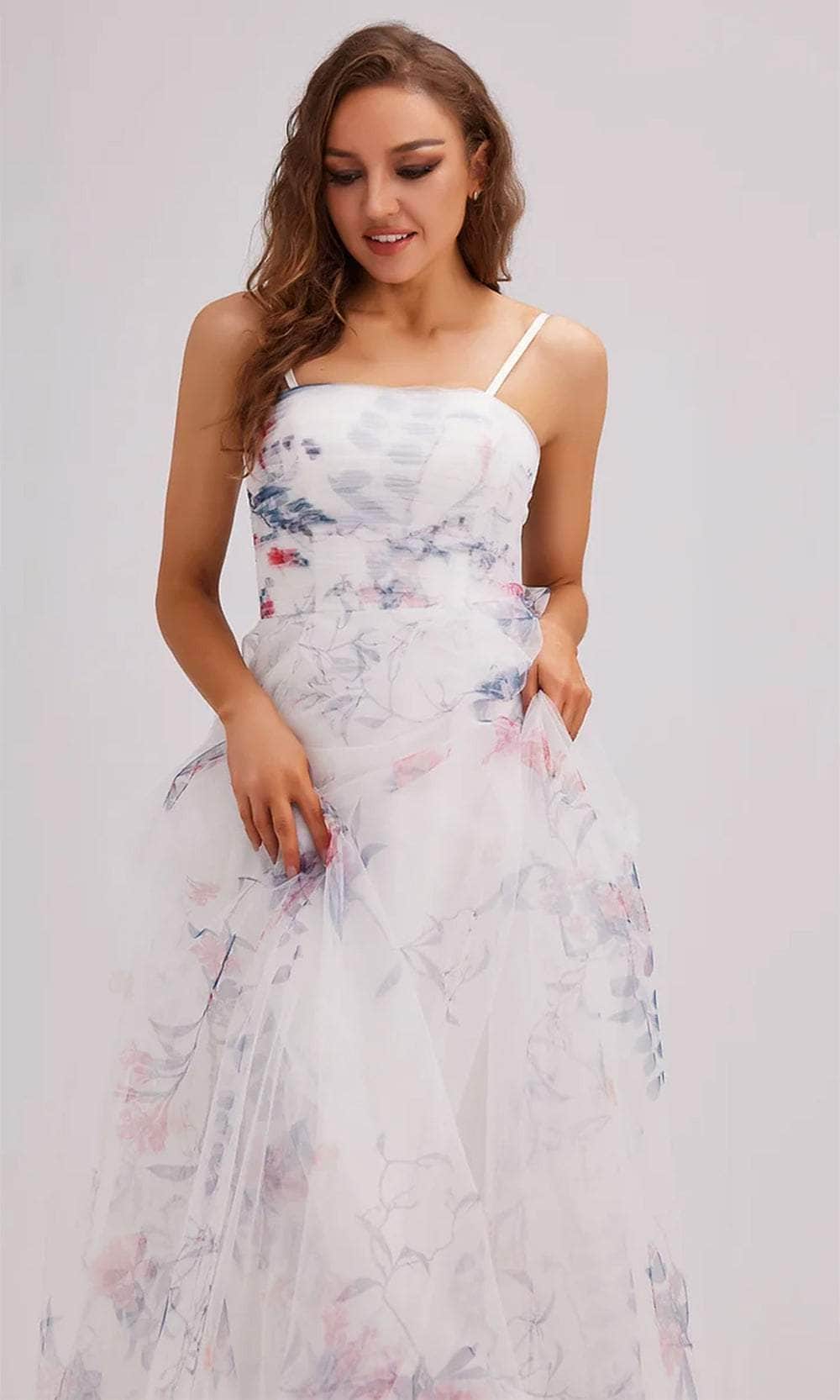 Beam with pride when you wear this Jadore J23021 gown exudes romantic charm, tailored from floral printed fabric. It features a fitted bodice crowned with a straight-across neckline and supported by delicate spaghetti straps. A center zipper closure at the mid-open back ensures a perfect fit. The floor-length ruffled skirt flows in a graceful A-line silhouette, adding an elegant touch. This enchanting Jadore J23021 seamlessly blends sophistication and whimsy, perfect for making a memorable entrance at any special event. Model is wearing Ivory/Multi color.