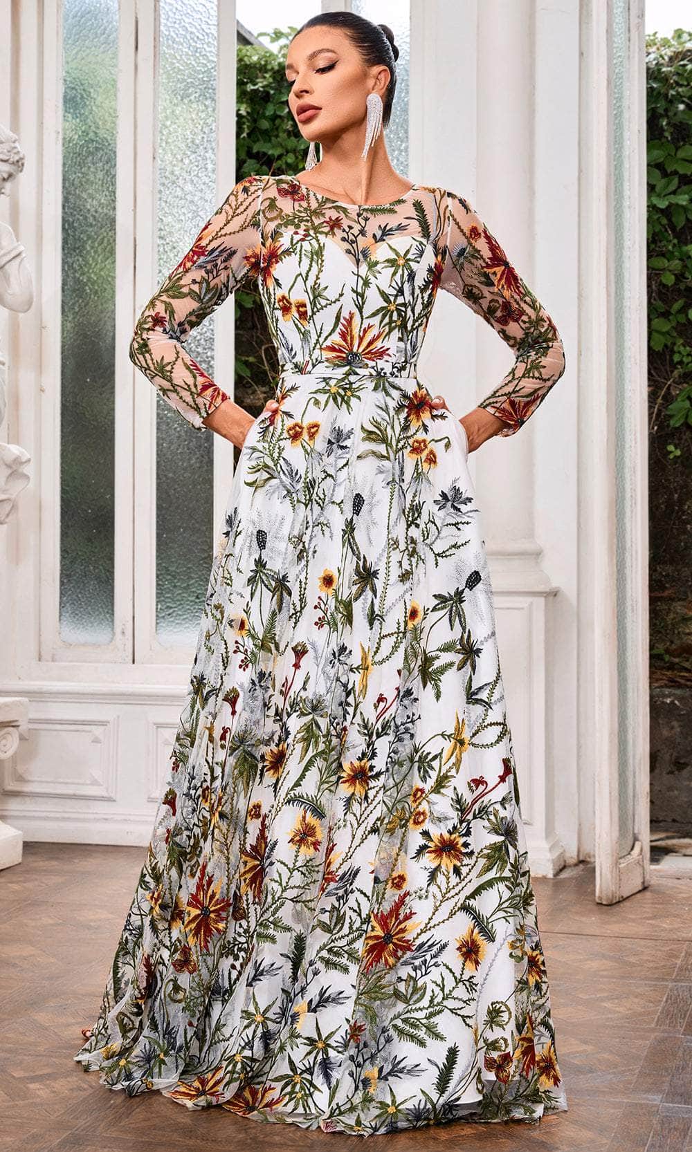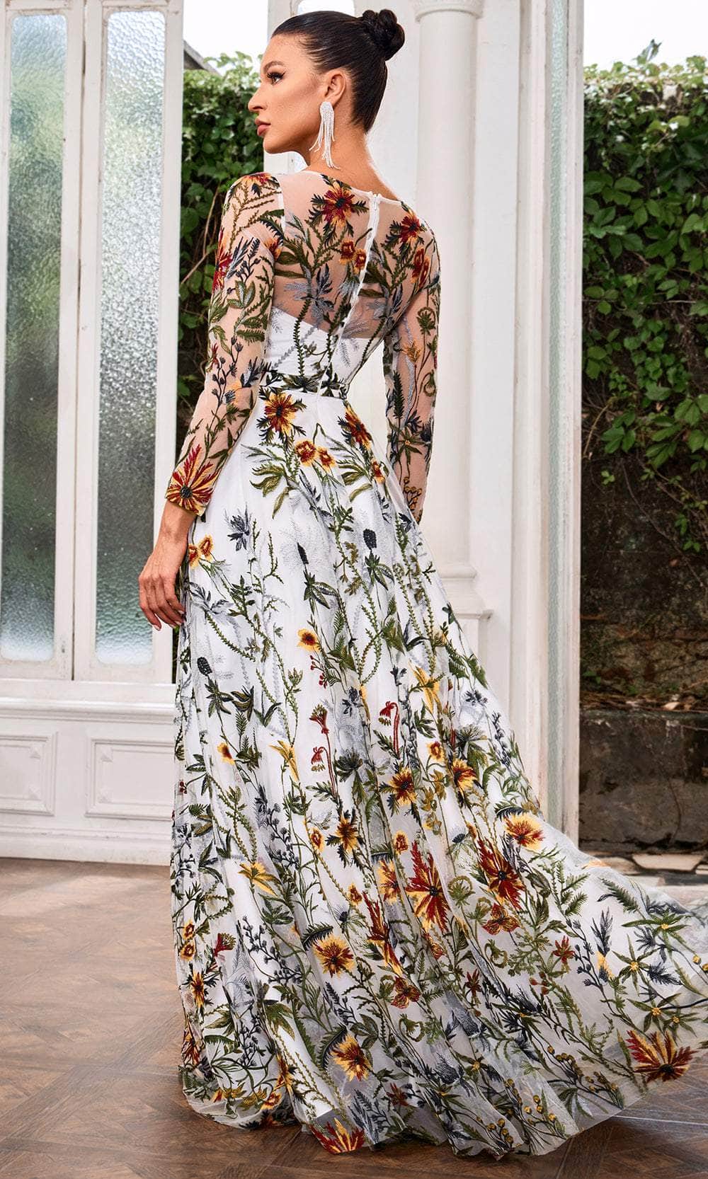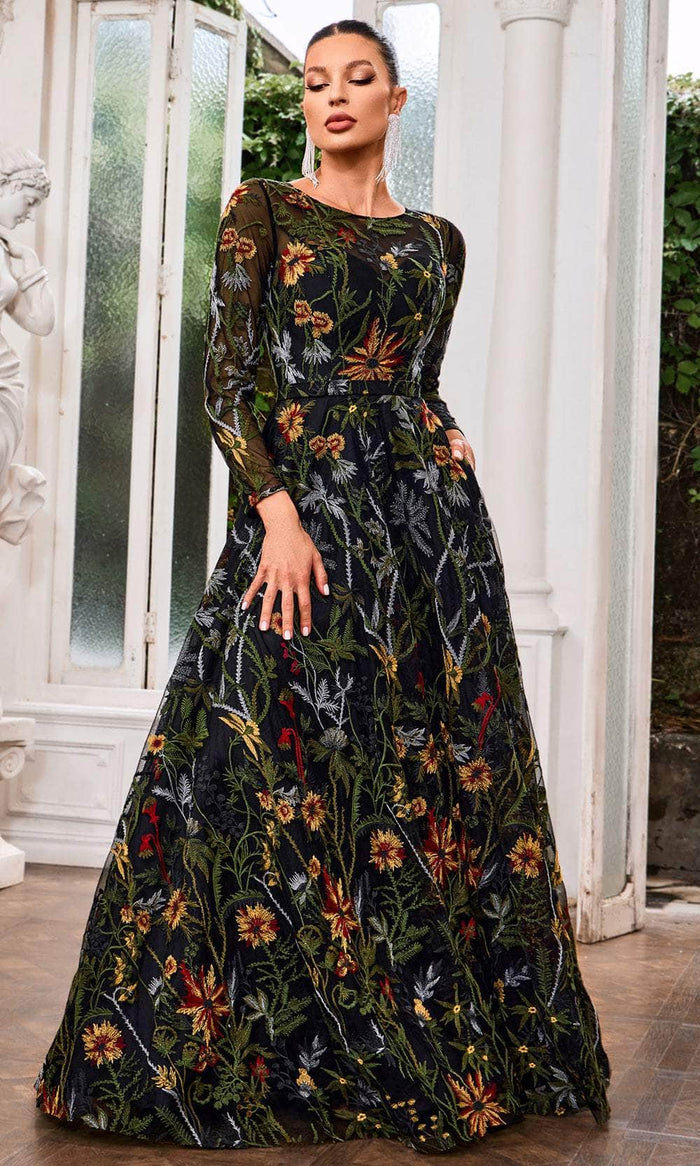 | Details: | Long Sleeves, Floral Embroidered, Semi-Sheer Full Back, Concealed Zipper Closure, Floor Length Hem |