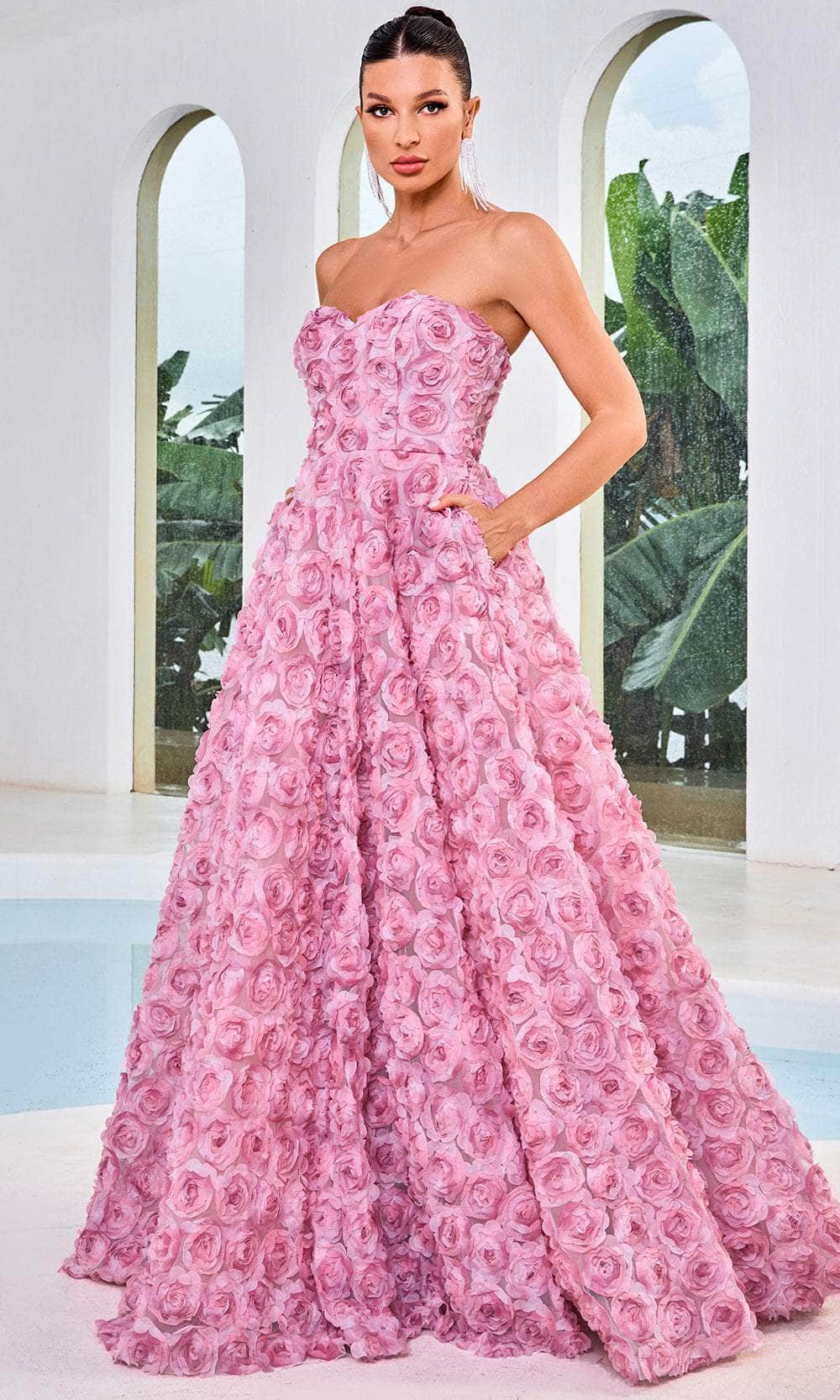 | Details: | Strapless, Pockets, Floral Texture, Midrise Back, Concealed Zipper Closure, Sweep Train |