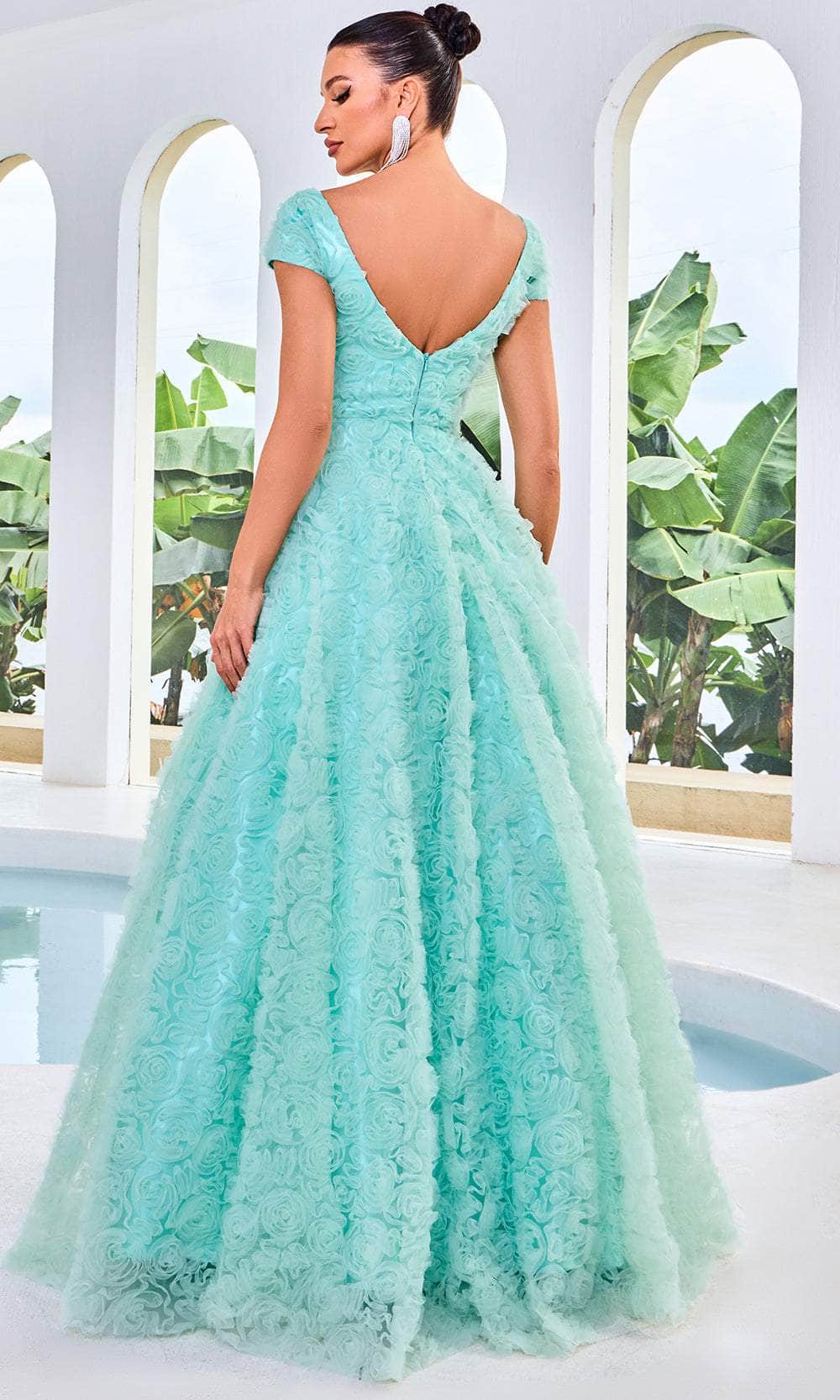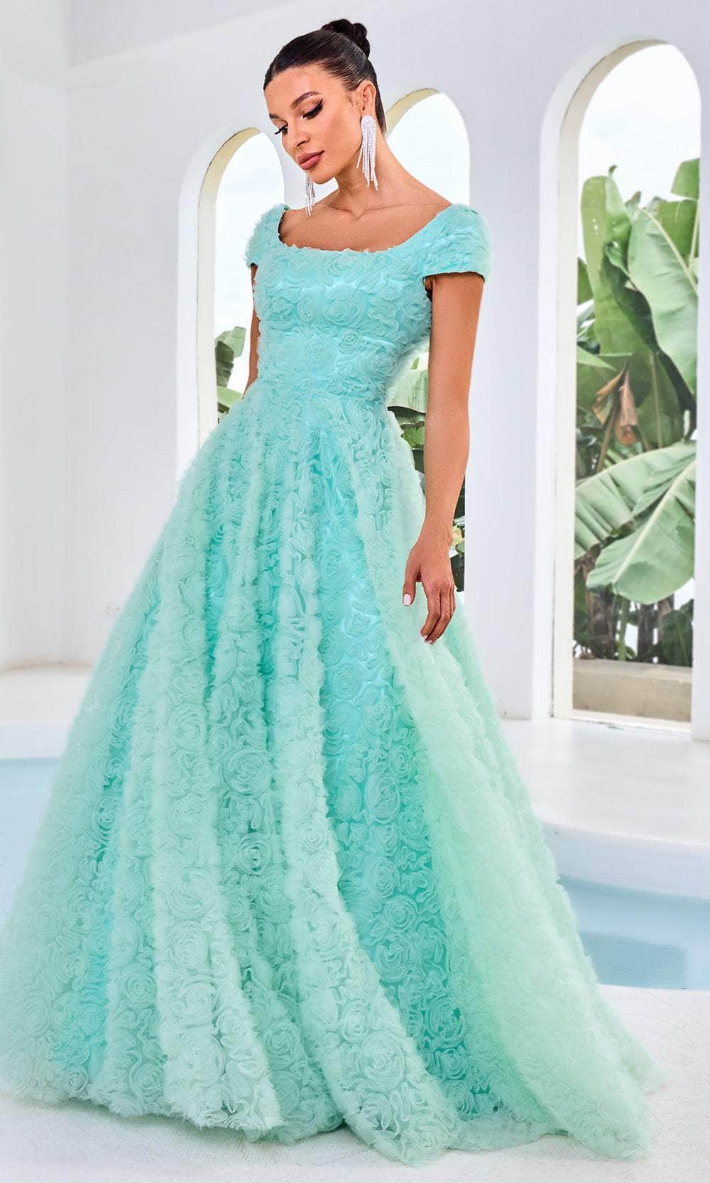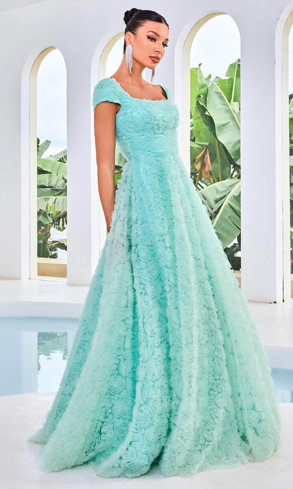 Leave a lasting impression at any event in this Jadore Dresses J24044 creation. This gown is a vision of beauty and charm, which is fully decorated with ruffled floral appliques. It also shows off a square neckline, wide waistband, and cap sleeves. Skin is revealed at the back by its midrise v-shaped cut, while being fastened by center zipper closure. The skirt sculpts a full length ballgown silhouette that adds a touch of grandeur to your look. This Jadore Dresses J24044 creates a truly magical evening. Models are wearing Ivory, Mint, and Lavender colors.