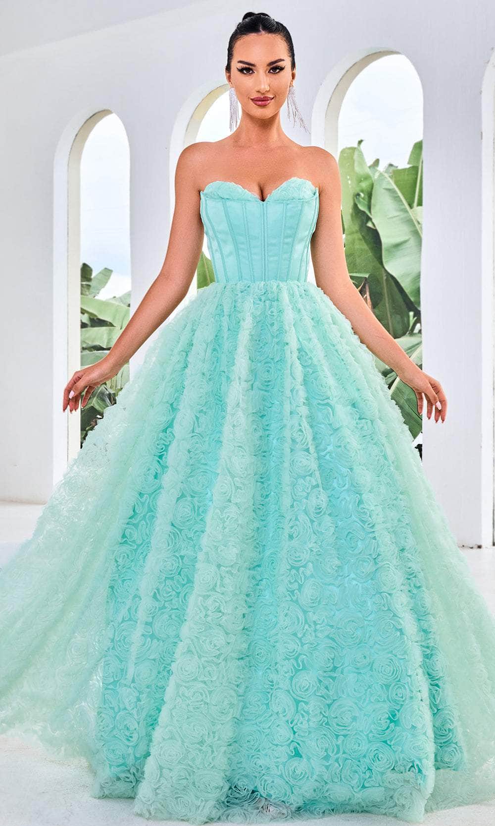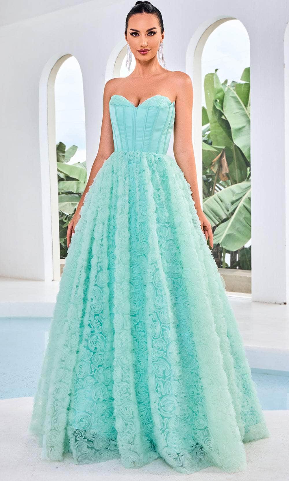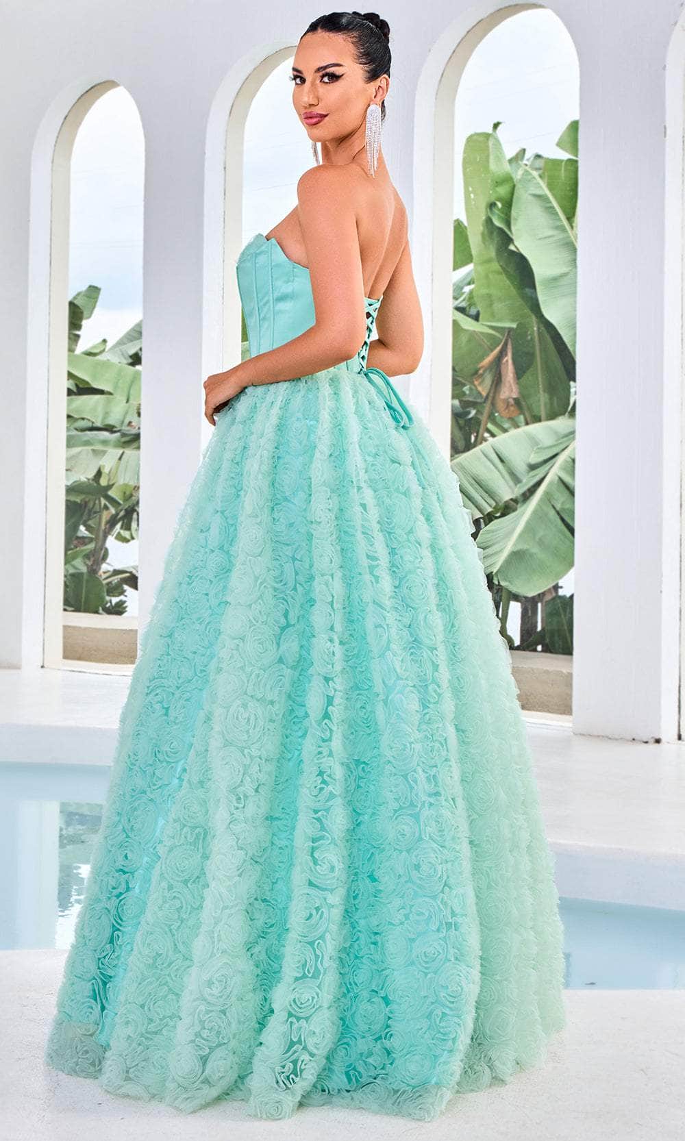 Make magic in this fantastic creation from Jadore Dresses J24045. Decorated with ruffle floral appliques, this strapless gown exudes a feminine charm that captivates from every angle. It consists of a corset bodice with exposed boning that hugs your curves for a flattering fit. The sweetheart neckline pairs perfectly with a midrise lace-up back. Lastly, the skirt moulds an A-line silhouette that enchantingly flows to the floor length hemline. Turn heads instantly when you wear this Jadore Dresses J24045 masterpiece. Models are wearing Ivory, Mint, and Lavender colors.