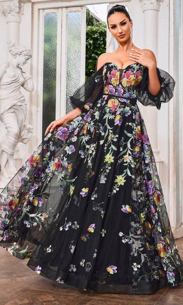Make a splash in this glamorous creation from Jadore Dresses J24047. This ensemble is detailed with a floral print that adds a pop of color and femininity. It showcases a trendy off-shoulder design that has a plunging sweetheart neckline, illusion quarter-length sleeves and a low v-shaped back. The thin waistband accentuates your curves. With a horsehair trim finish, the skirt carves an A-line silhouette that glides to the full length hem. This Jadore Dresses J24047 stunning look for any special event. Models are wearing Nude/Multi, and Black/Multi colors.