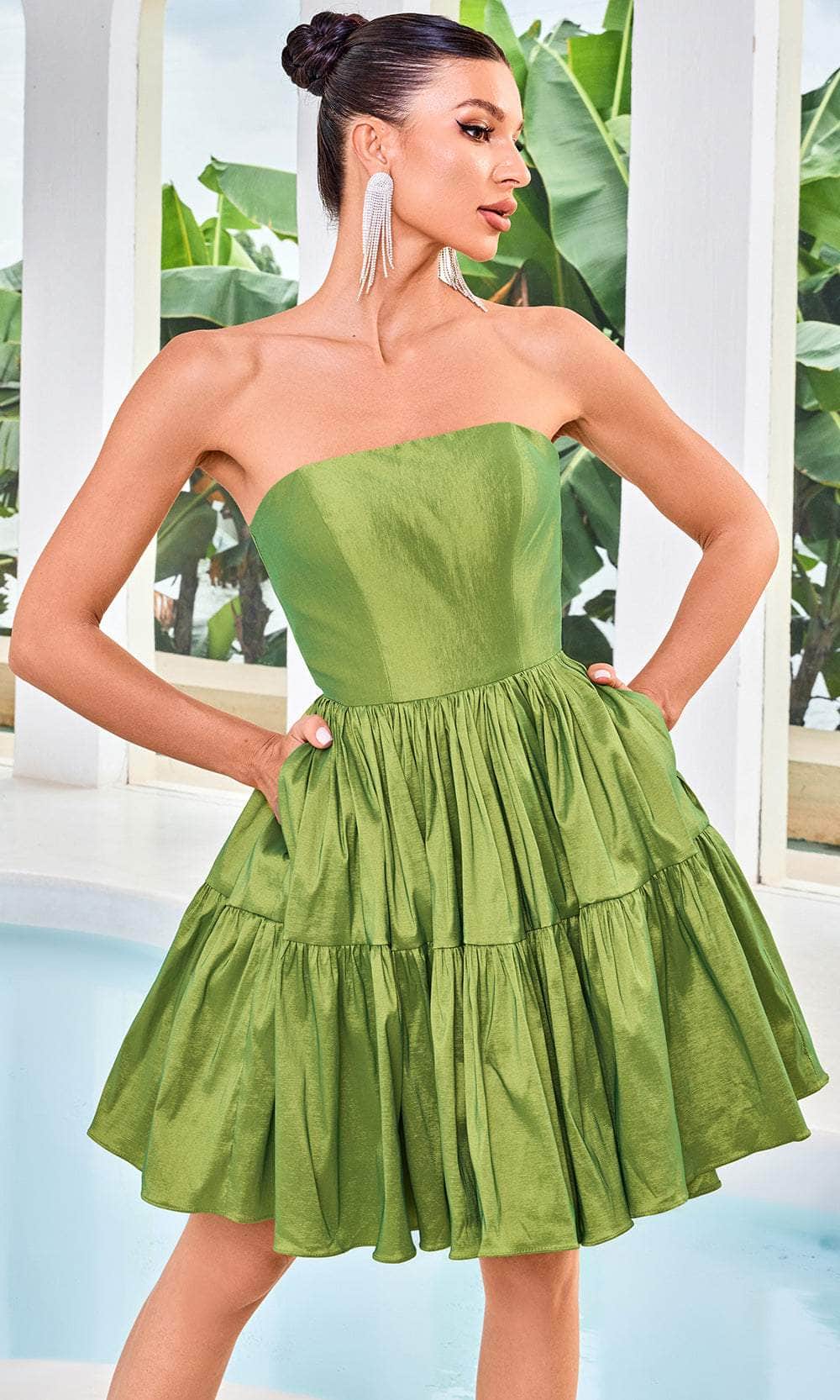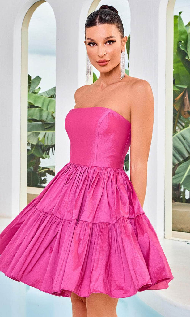 Show off your inner charms in this creation by Jadore Dresses J24077. This gorgeous dress simply highlights your shoulders and collarbones with its straight across neckline and strapless shape. The back is cut in mid-open and has an adjustable lace-up design to guarantee a perfect fit every time. With ruched tiers detailing, the skirt carves an A-line silhouette that moves smoothly to the mid-thigh hemline. This Jadore Dresses J24077 masterpiece is truly remarkable! Models are wearing Hot Pink, Navy, and Light Green colors.