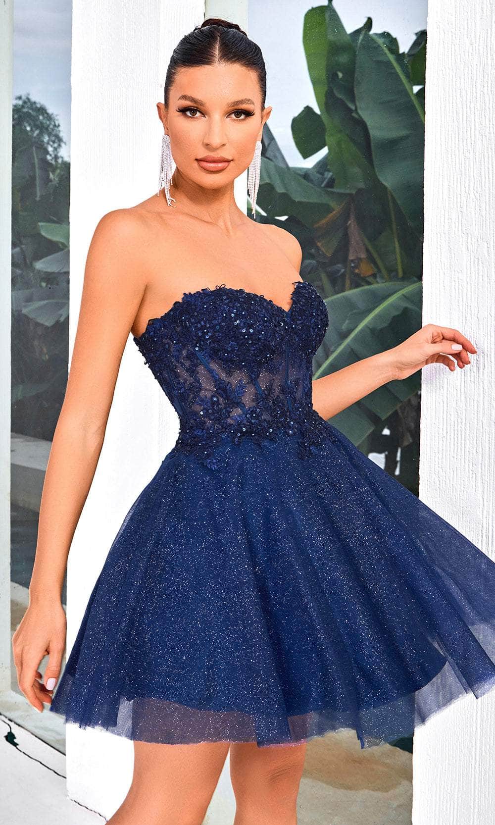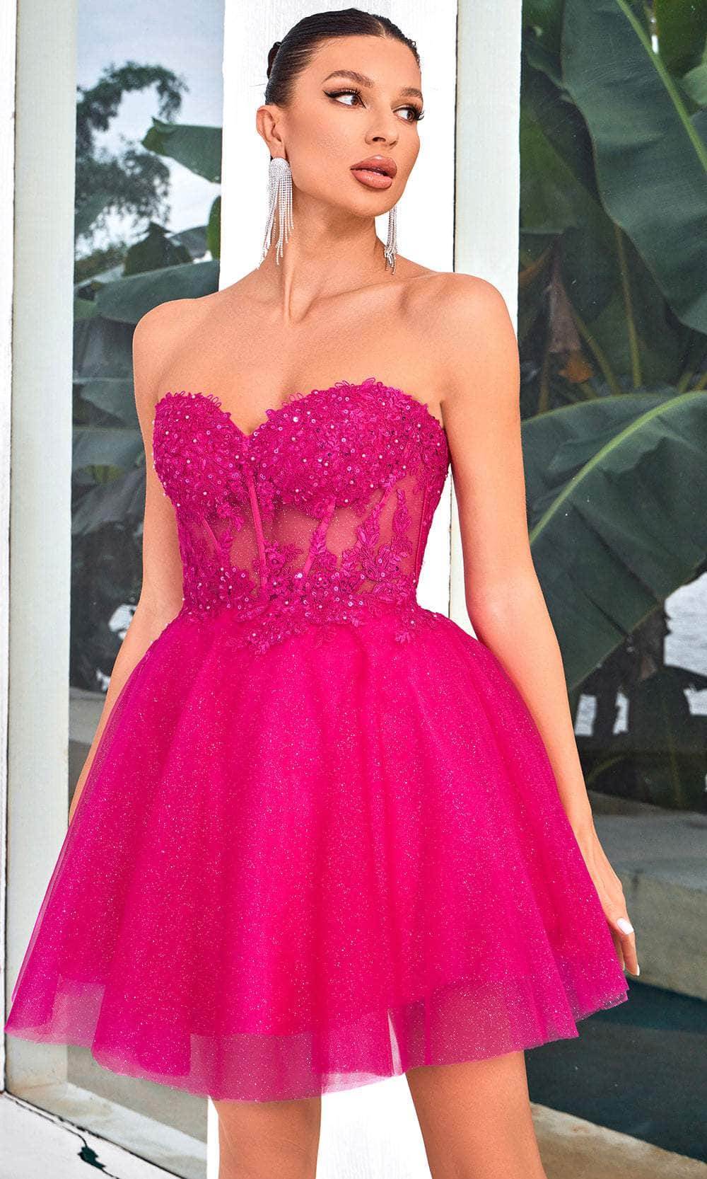 Let your inner beauty shine in this Jadore Dresses J24080 masterpiece. This strapless ensemble is adorned with lace appliques and beadings that exude charm and grace. The top showcases an illusion corset boning bodice, a sweetheart neckline, and mid-open back closed by the adjustable lace-up closure. The sparkle tulle skirt makes a stunning A-line silhouette that descends to the short hemline. At any gathering, this Jadore Dresses J24080 design will make you the center of attention. Models are wearing Hot Pink, Navy, and Teal colors.