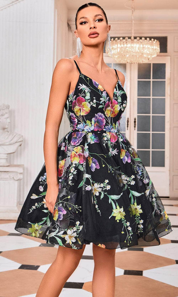 Bloom with loveliness in this floral J'Adore Dresses J24089, a mesmerizing creation that embodies timeless elegance. Crafted from ethereal tulle fabric, this dress features a sleeveless fitted bodice adorned with delicate spaghetti straps and a graceful V-neckline. The lace-up back adds a touch of allure, ensuring a perfect fit. The short-length A-line skirt completes the look, offering both comfort and sophistication. Radiate charm and grace in this enchanting J'Adore Dresses J24089, where every detail is meticulously designed to captivate and leave a lasting impression. Models are wearing Black/Multi and Nude/Multi colors.