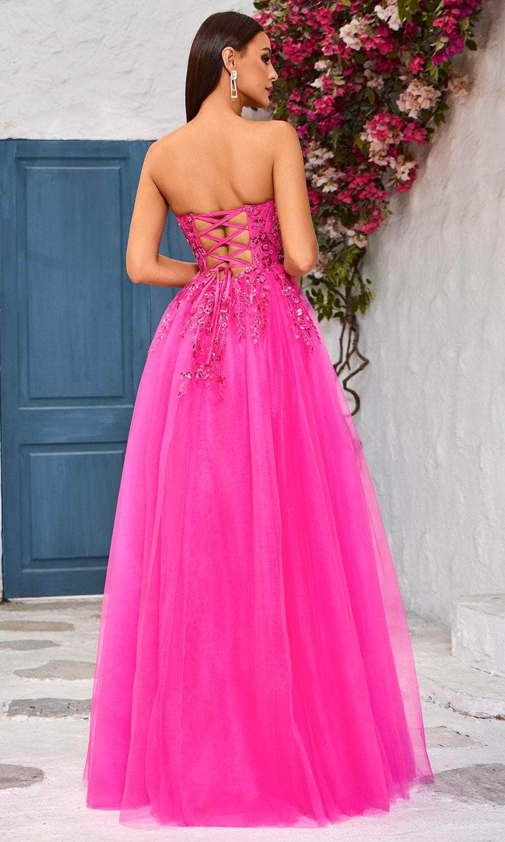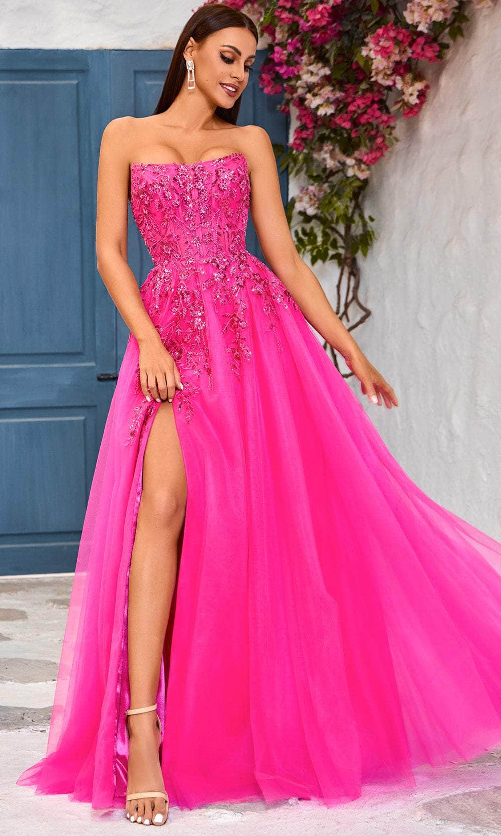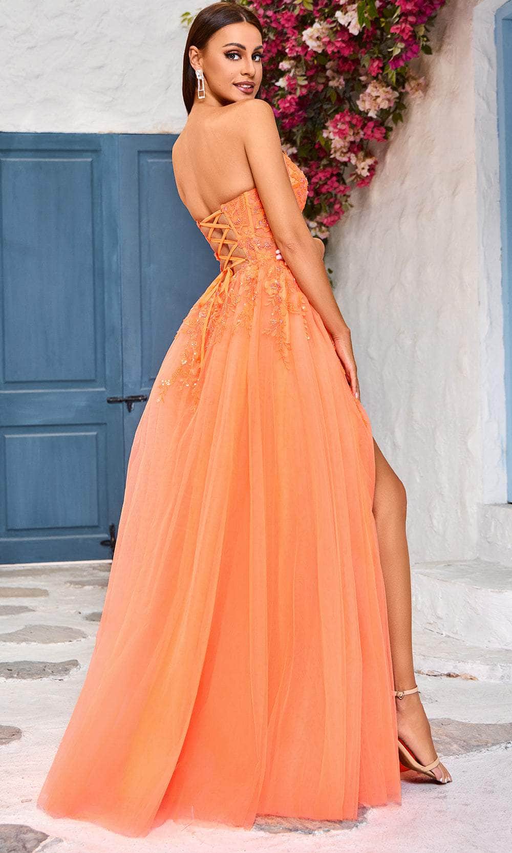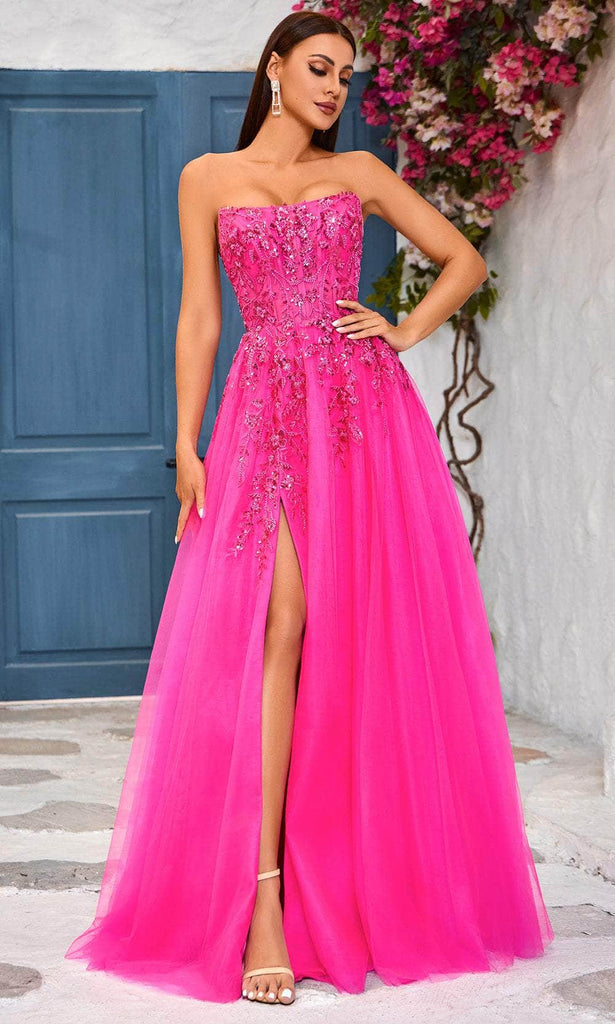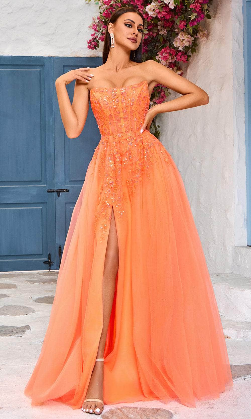 Make a statement and dazzle in any event in the Jadore Dresses J25017 masterpiece. Stunning in strapless design, the dress decorated in beadworks with vines and floral motifs of embroidery creates a truly mesmerizing effect. The straight-across neckline attractively frames your face, while the illusion corset bodice visible boning and the lace-up tie in the midrise back exude timeless charm. Made from a layer of tulle, the full length skirt creates a dreamy A-line silhouette and opens a high slit for a flirty leg exposure. All eyes will be drawn to you in the Jadore Dresses J25017 creation. Models are wearing Bright Pink, Navy, and Orange colors.