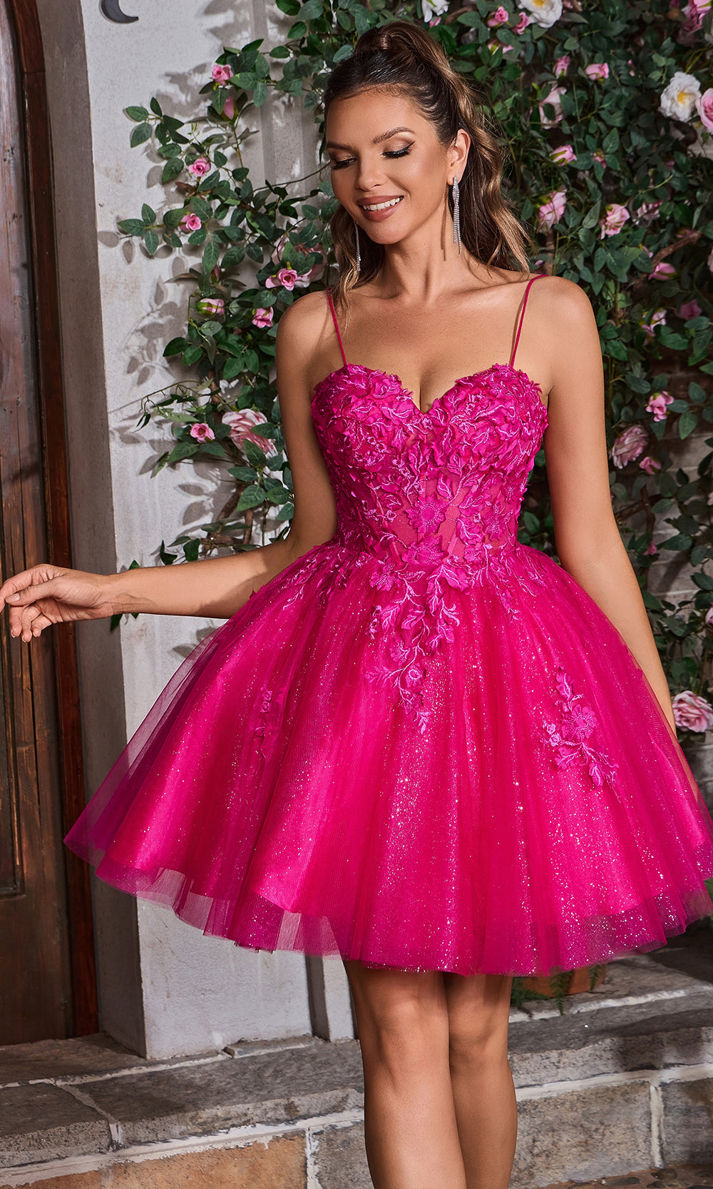 Radiating fairytale glamour with a youthful twist, this dazzling Jadore Dresses J26077 mini makes every moment feel like a celebration. Every element of this dress is made to delight, from the 3D floral embroidery to the dazzling glitter finish layered over soft tulle. The sweetheart neckline is delicately framed by thin spaghetti straps, complementing the sheer corset bodice that defines the upper silhouette with grace. A natural waist leads into an A-line skirt that flows with lively movement and light-catching detail. Created to inspire joy and confidence, Jadore Dresses J26077 is a radiant choice for unforgettable evenings. Models are wearing Navy, Hot Pink, and Sage colors.
