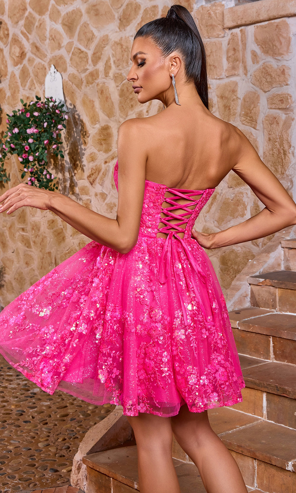 Capture the light and attention in this Jadore Dresses J26091 that dazzles from every angle. It delivers fairytale elegance with its strapless straight neckline and strapless bodice adorned in sequin floral embroidery. The short A-line skirt flows gracefully, creating a dreamy sense of movement with each step. Soft tulle layers add volume without weight, while glistening embellishments offer a magical touch. Wear Jadore Dresses J26091 to embody grace, beauty, and radiance all at once. Models are wearing Periwinkle, Bright Pink, and Grey colors.