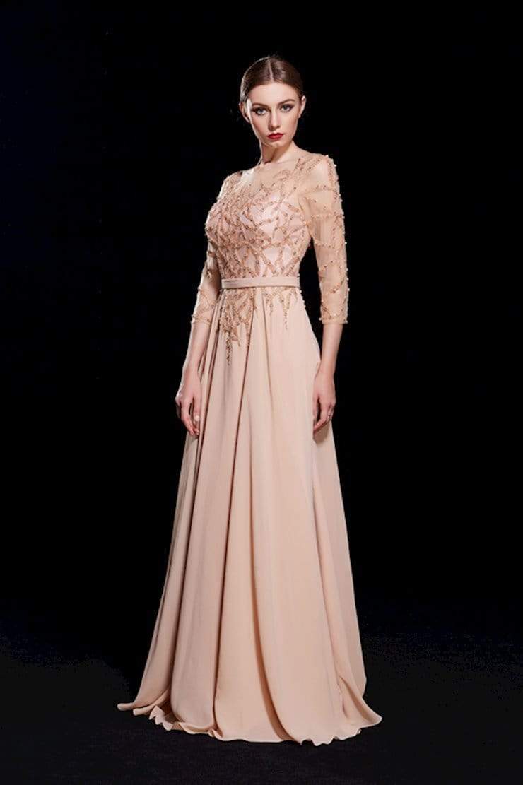 | Details: | Bead and Lace Embellished Bodice, Sheer Neckline and Quarter Length Sleeves, Banded Waist, Pleated Skirt, Floor Length, V Back, Back Zipper Closure, Small Train |