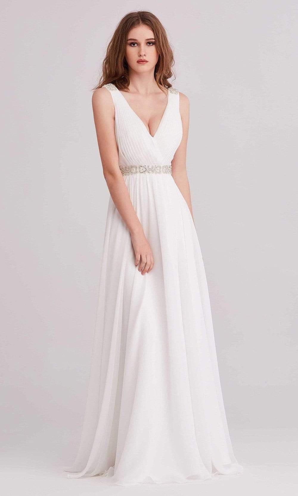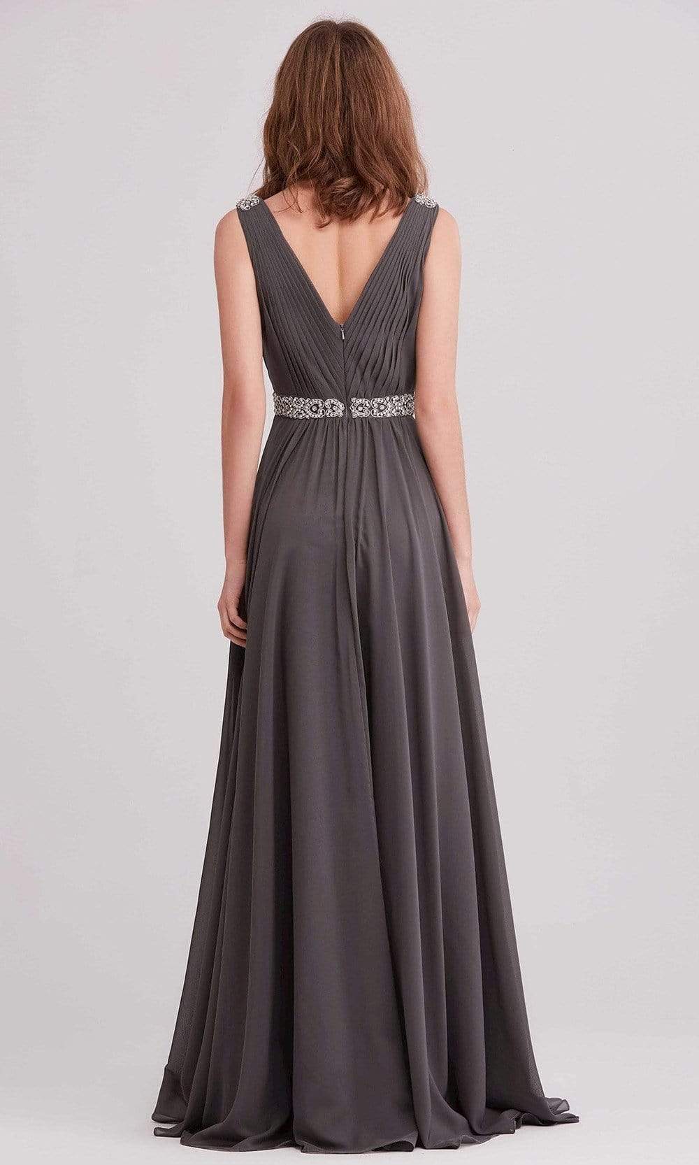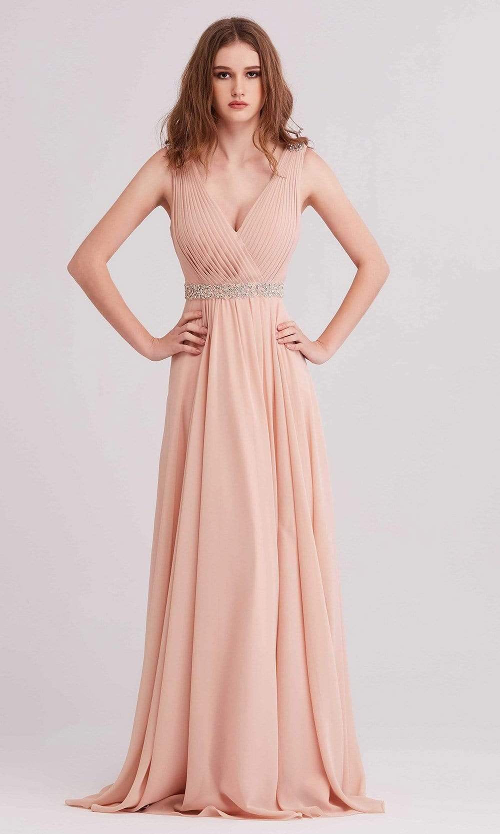 Get glamorous look with this dress by J'Adore J15002. This chiffon dress glams in a sleeveless, plunging V neckline with a pleated bodice and a V back. The dress has a back zipper closure and a beaded waist. The skirt is tailored in a full length A-line silhouette with a high leg slit. This J'Adore dress is perfect for any formal evening.